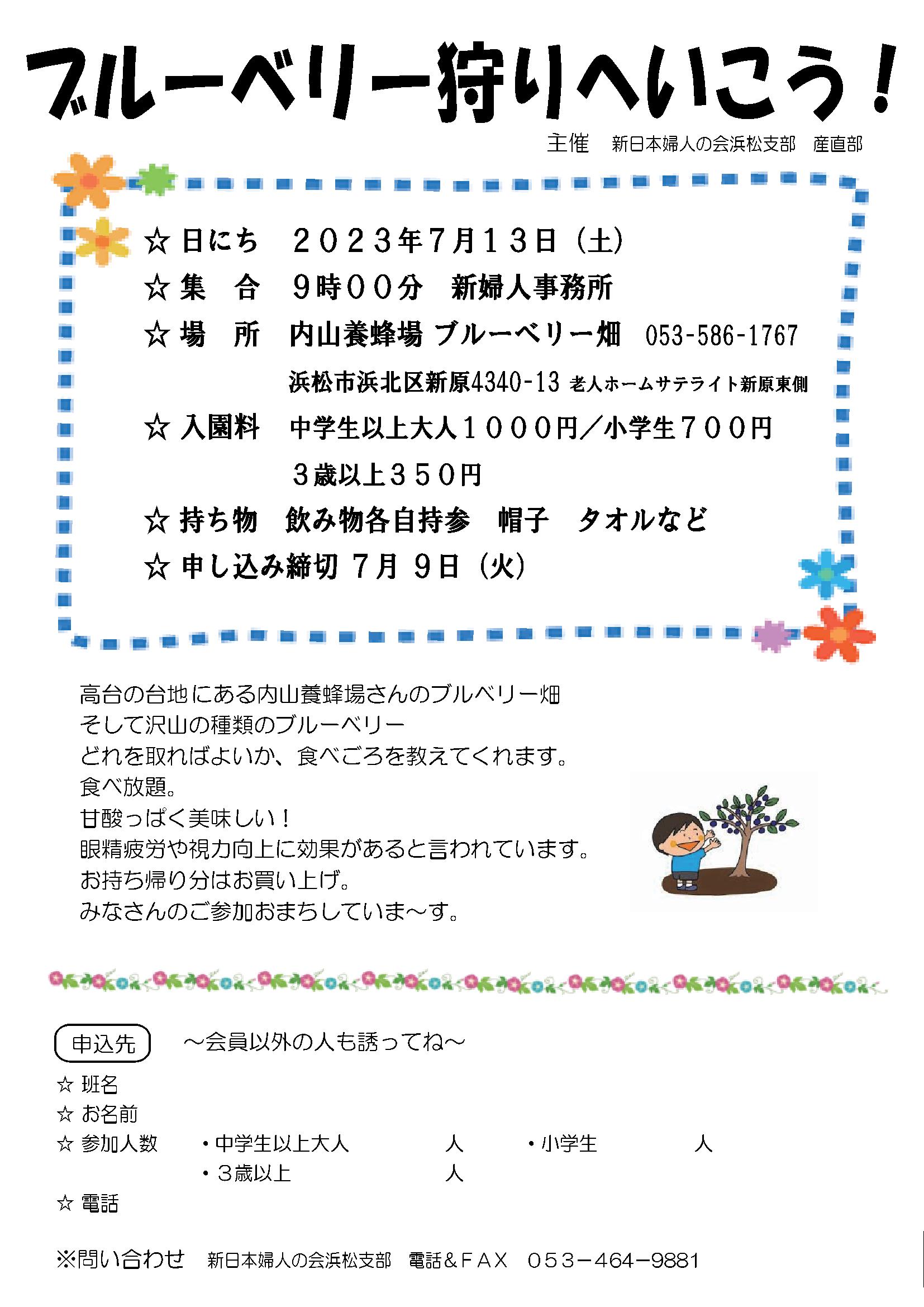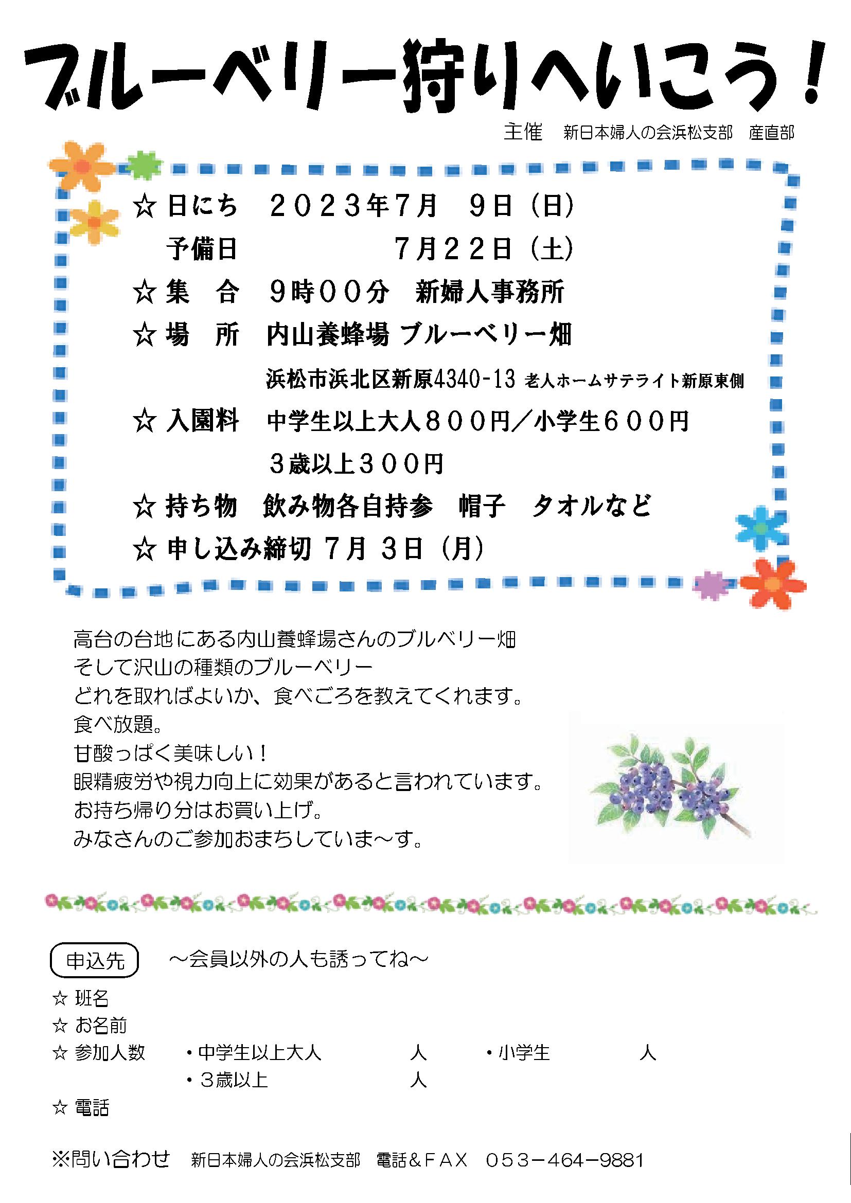 ブルーベリー狩りへいこう! 新日本婦人の会浜松支部 電話&FAX 053-464-9881