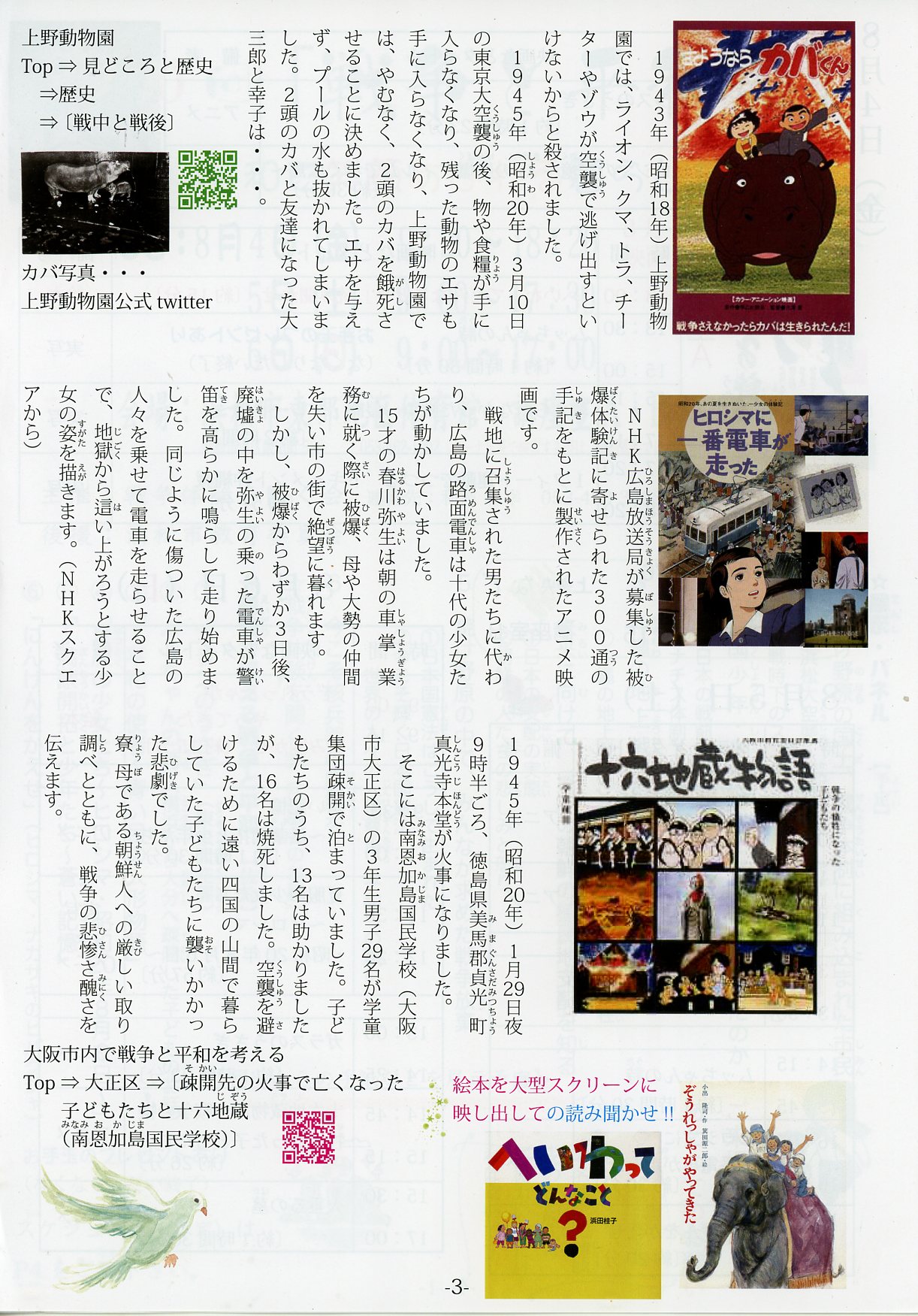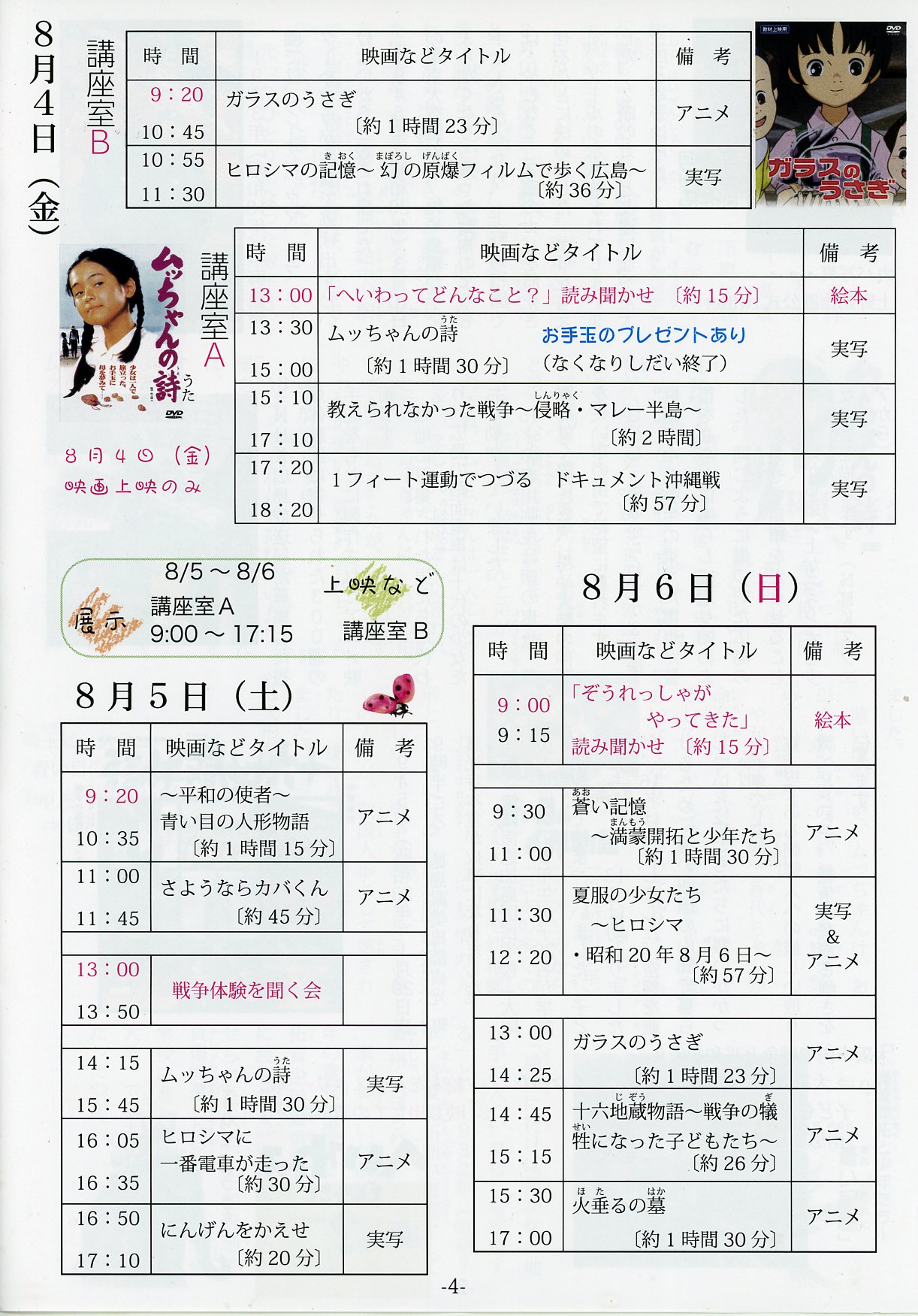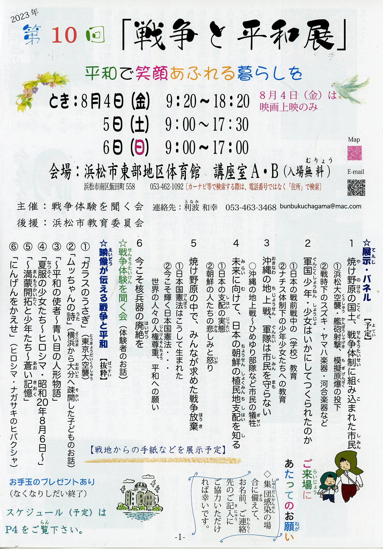 08月04-06日(日)浜松市東部地区体育館 第10回「戦争と平和展」 平和で笑顔あふれる暮らしを スケジュール(予定) 上映作品の紹介 見どころ 戦争を聞く会