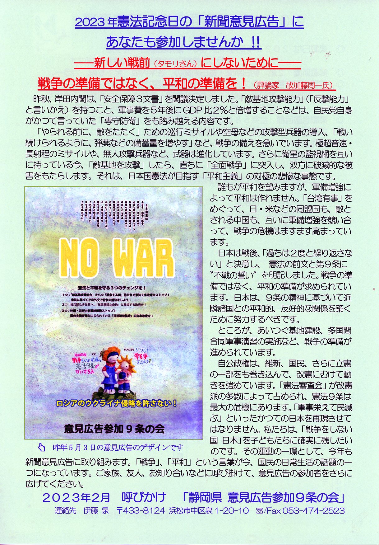 2023年憲法記念日の「新聞意見広告」にあなたも参加しませんか 新しい戦前にしないために