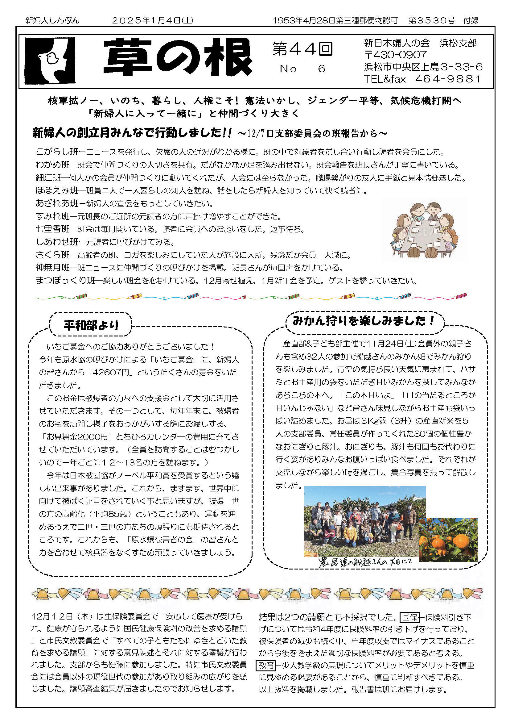 2025年1月4日(土) 草の根 第44回 No06発行 みかん狩りを楽しみました。 お餅つきだよ みんな集合 新日本婦人の会浜松支部機関紙