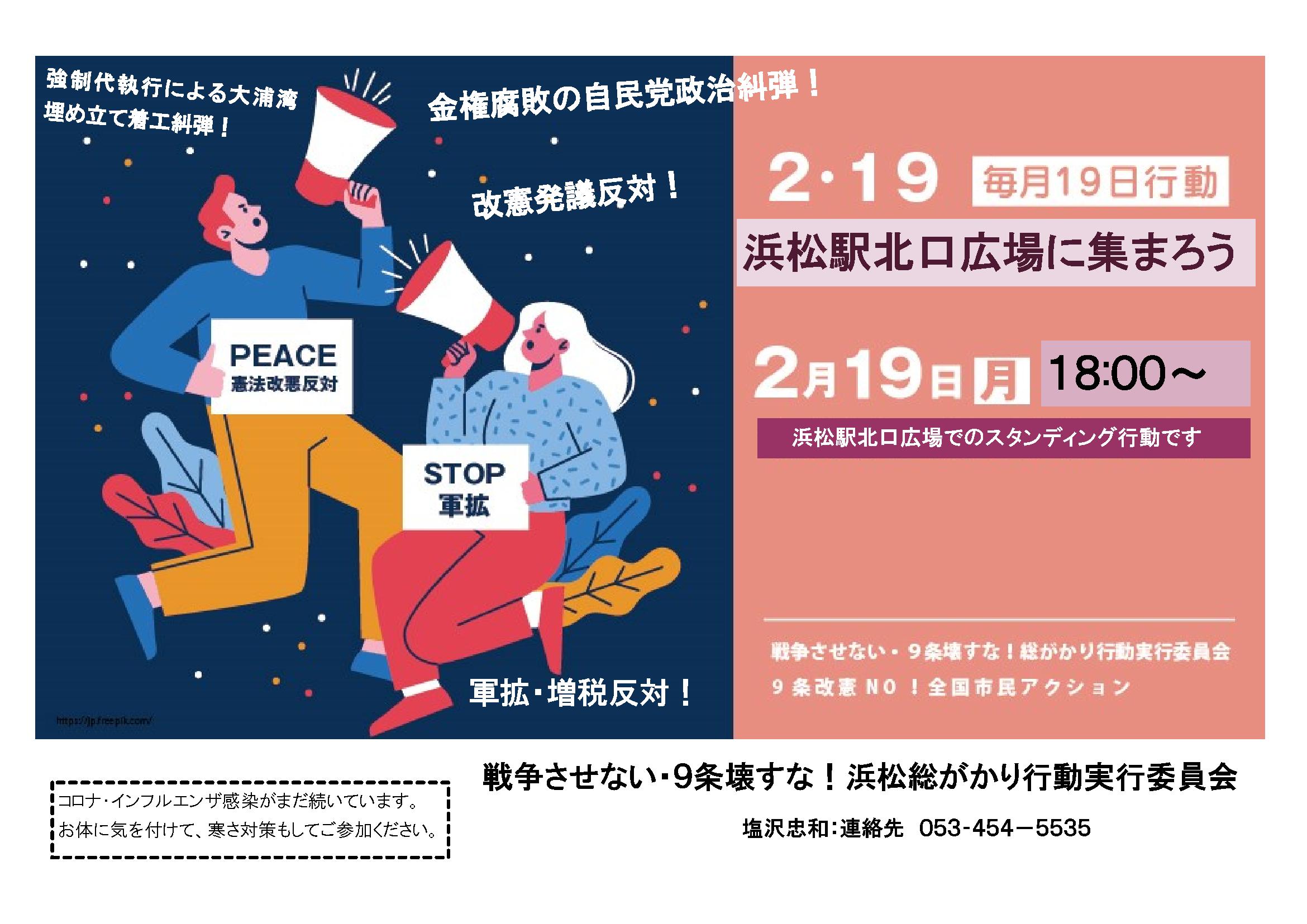 2月19日(水)18:00~ 浜松駅北口広場 STOP軍備拡大 戦争させない・9条壊すな!総がかり行動浜松実行委員会