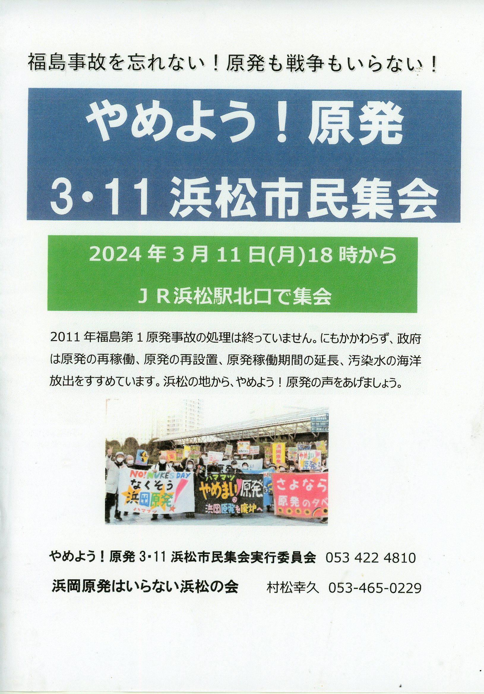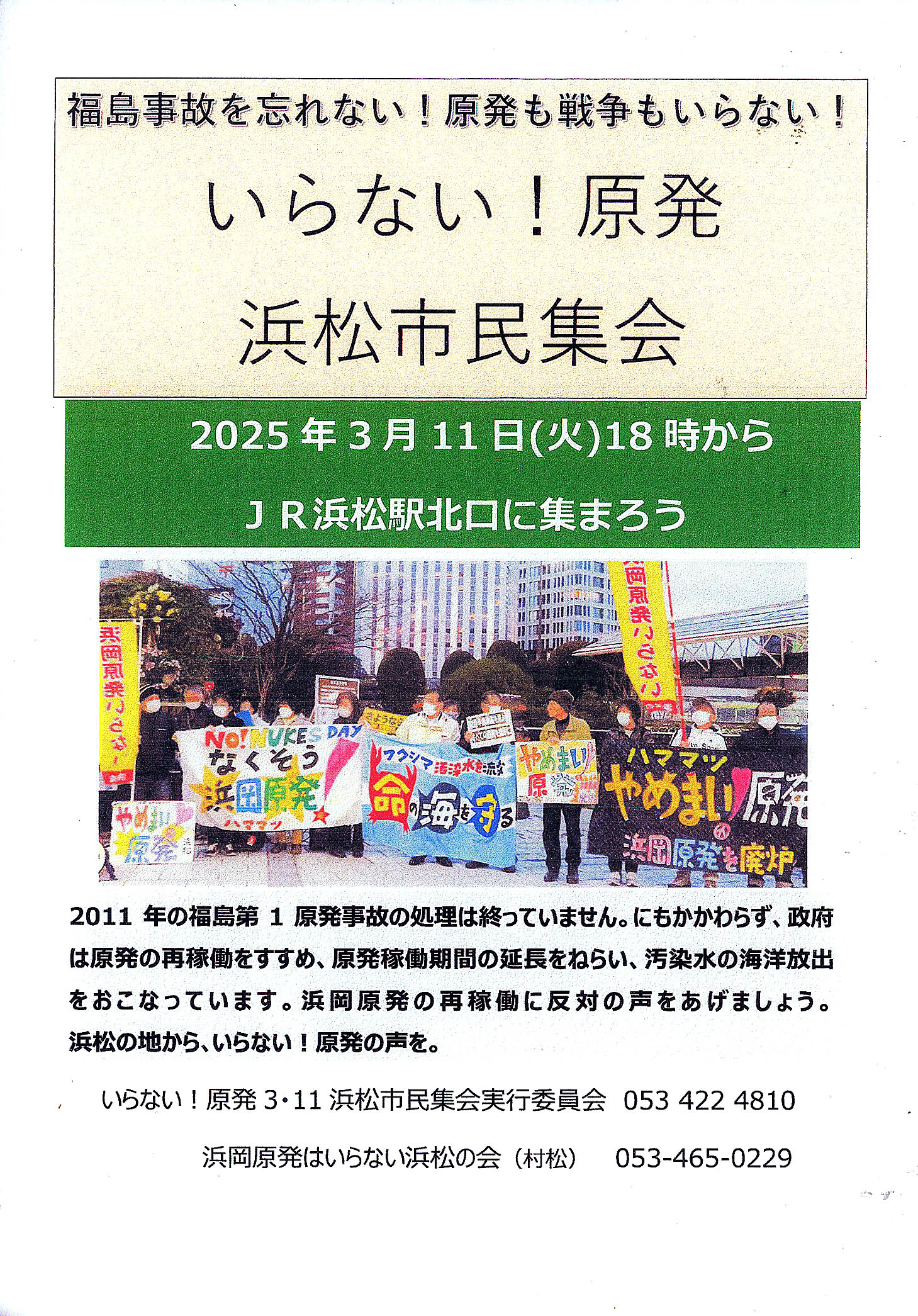 3月11日(火)18時 JR浜松駅北口広場 福島事故を忘れない! 原発も戦争もいらない! 「いらない!原発浜松市民集会」 いらない!原発3・11浜松市民集会実行委員会