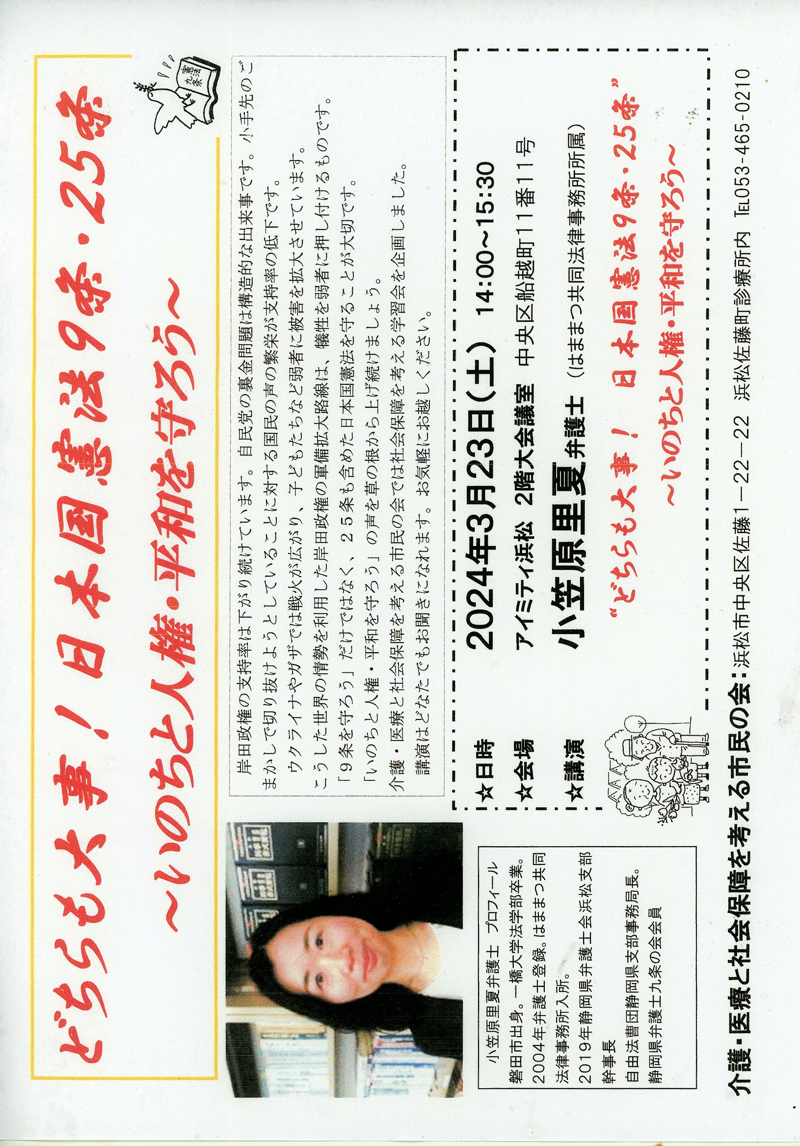 5月3日(土・祝)10時から12時 浜松地域情報センターホール 憲法記念日のつどい 「私たち・主権者の行動が憲法にいのちを吹き込む」 講師 太田啓子弁護士 浜松・憲法九条の会
