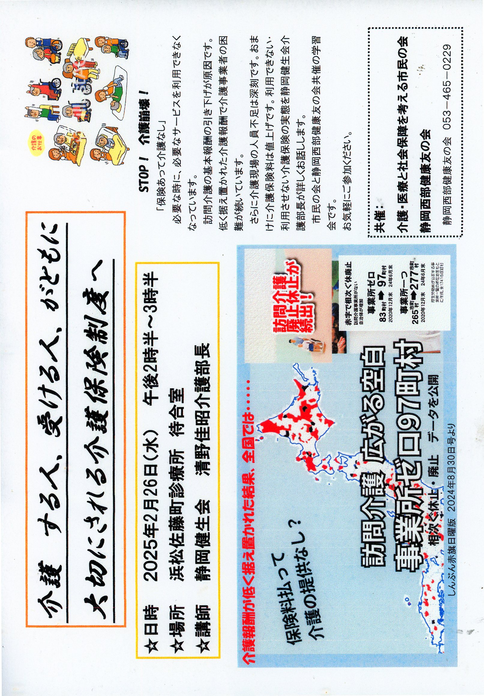 2月26日(水)14:30~ 浜松佐藤町診療所 待合室 介護する人、受ける人、がともに大切にされる介護保険制度へ 介護・医療と社会保障を考える市民の会