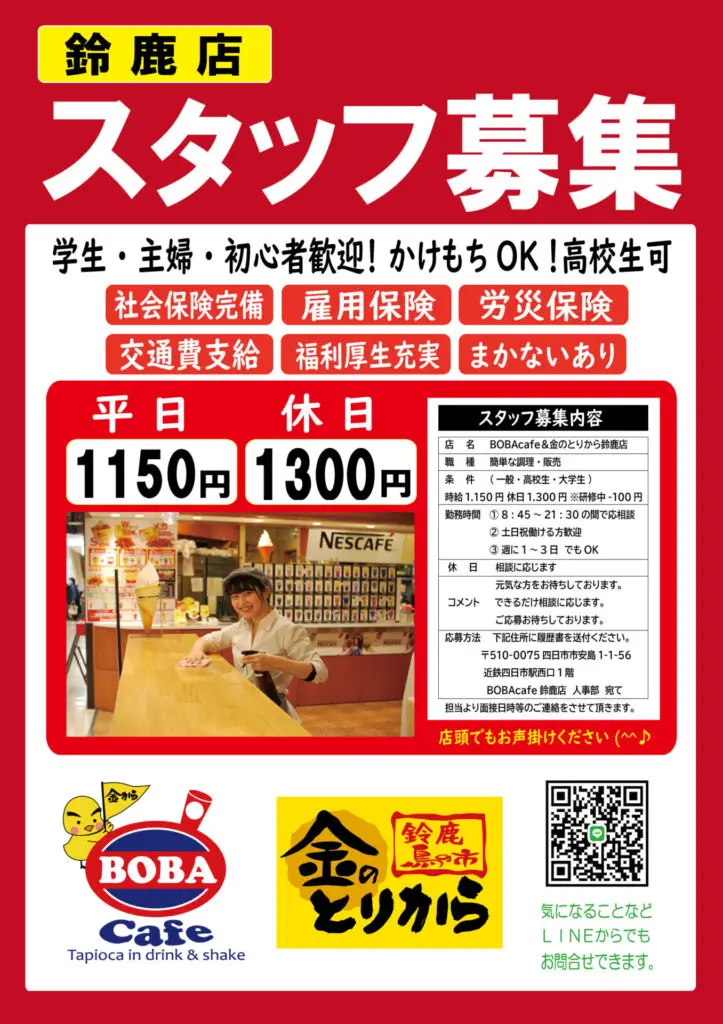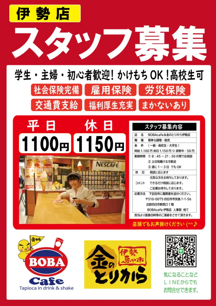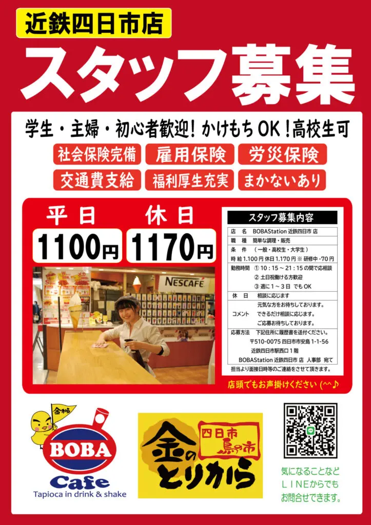 〒510-0075 四日市市安島1-1-56 近鉄四日市駅西口1階構内 BOBAcafe人事部 宛