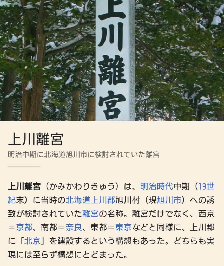 そにっく@ひのわ@sonic885101m agohttps://ja.wikipedia.org/wiki/上川離宮?wprov=sfla1上川離宮上川離宮(かみかわりきゅう)は、明治時代中期(19世紀末)に当時の北海道上川郡旭川村(現旭川市)への誘致が検討されていた離宮の名称。離宮だけでなく、西京=京都、南都=奈良…2