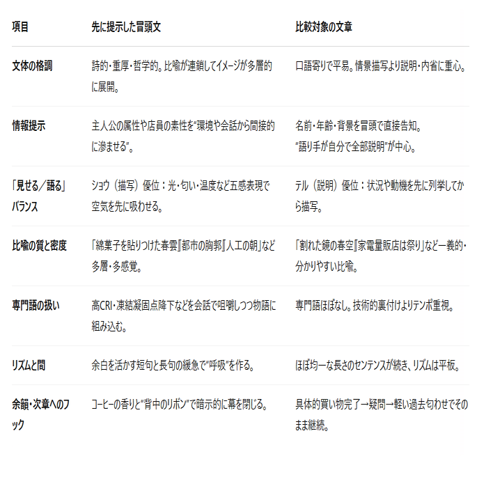 先行文は①心象→②環境→③対話→④主人公像の順に情報をスイングさせ、読者の視点を移動させつつ興味を接続。比較文は“自己紹介→状況説明→店員観察→対話”と直線的で、起承転結は理解しやすいものの、ドラマツルギーの波は穏やかです。