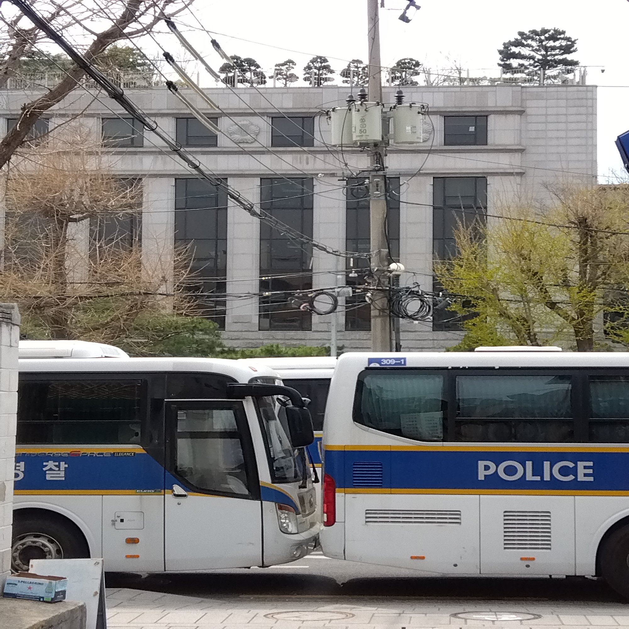 警戒態勢のわりには警備する側も道行く人々も、あまり緊張感が無さそうに見えるのは意外だった。罷免宣告から5日経っているからだろうか。立地のせいもあるかもしれない。永田町や霞ヶ関のような官庁街をイメージしていたが、そうではなかった。裁判所が位置する「三清洞」は二つの古宮に挟まれたエリアで、周辺は学校やカフェなどが多く、美術館や博物館もあって、文京地区の趣きがある。