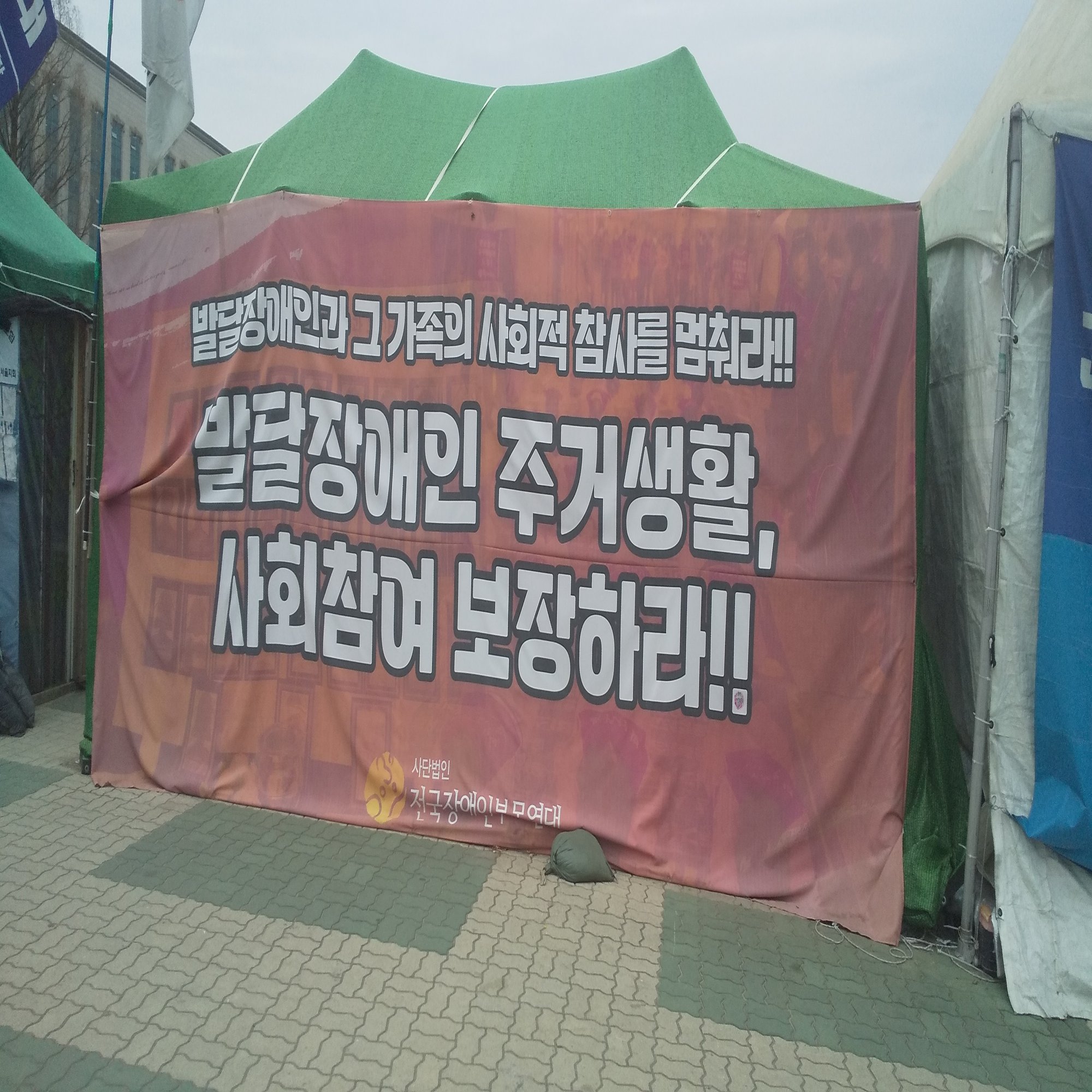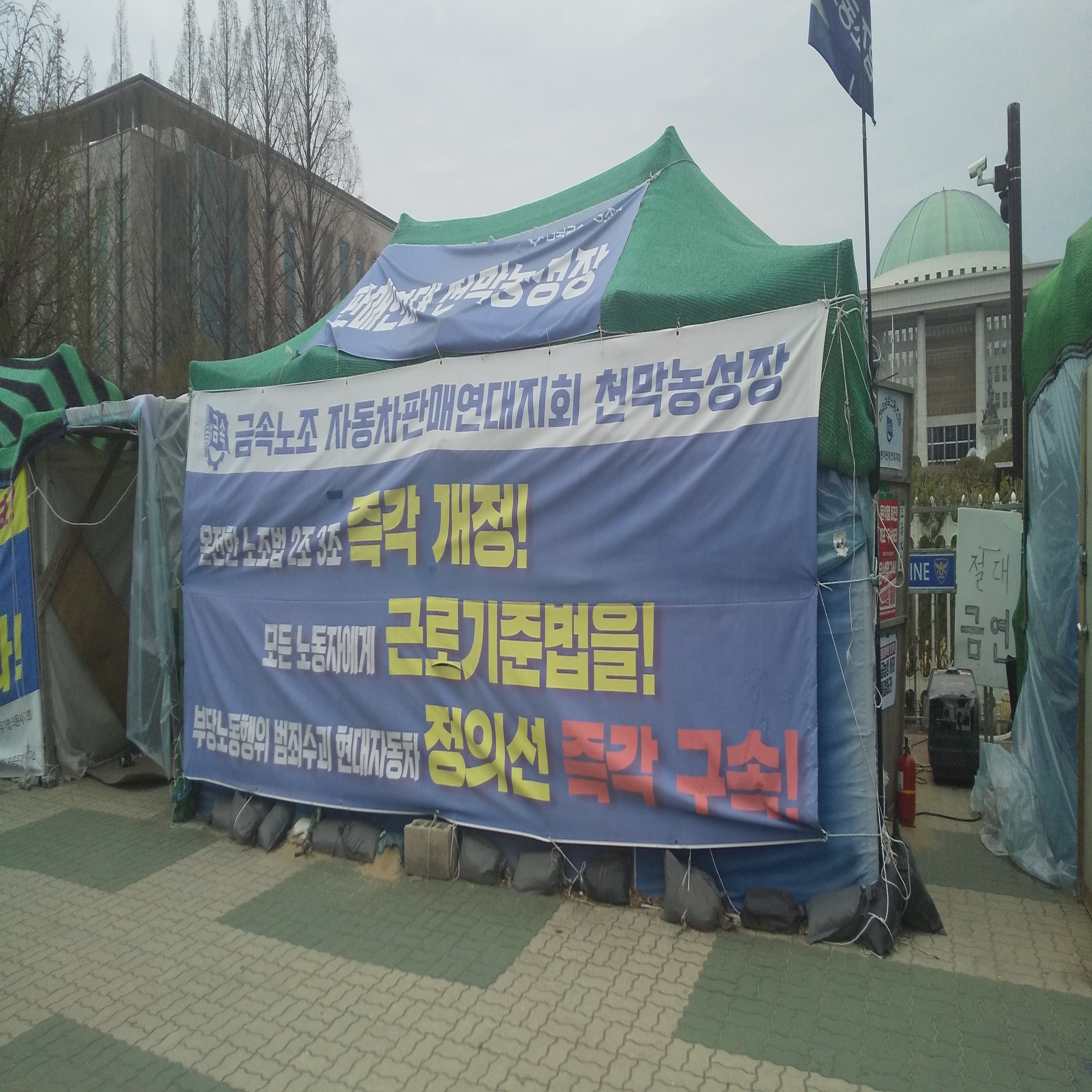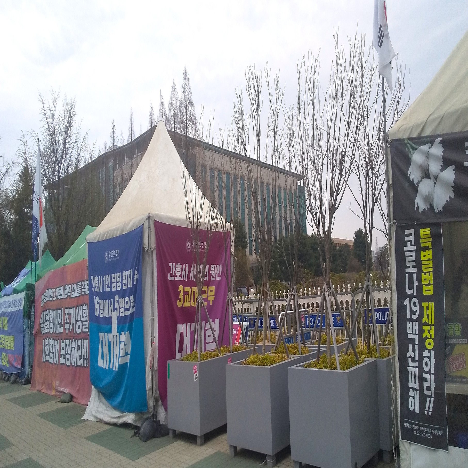 ソウルの街を歩いていると、公共施設などの前にテントが設置されているのをよく見かける。これらは労働問題やワクチン被害などの社会問題に対して抗議するためのもの。以下の写真は、国会議事堂の正面玄関脇にあったテント群。