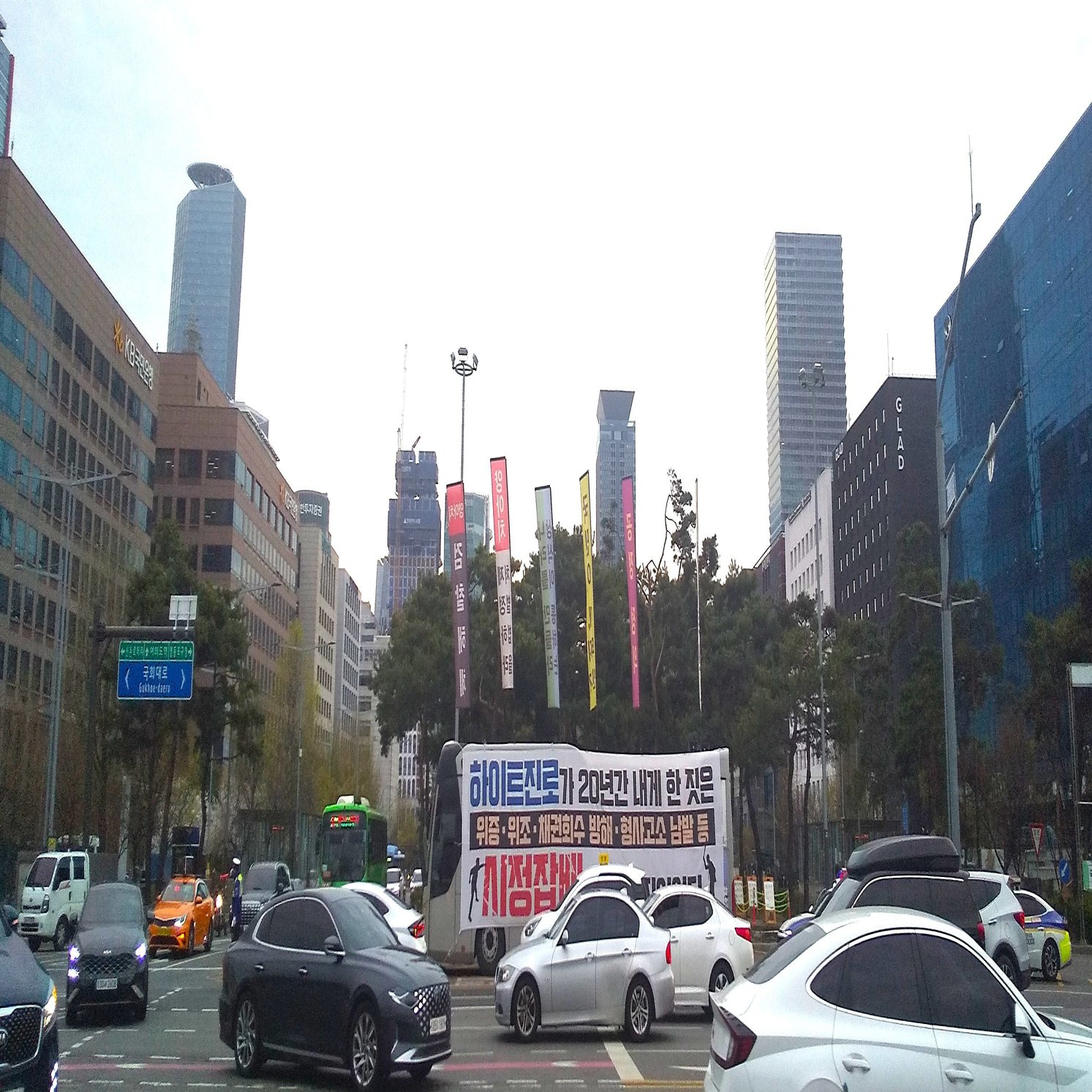 韓国では横断幕がよく使われている。国会議事堂前に停められたバスにも横断幕が張られていた。