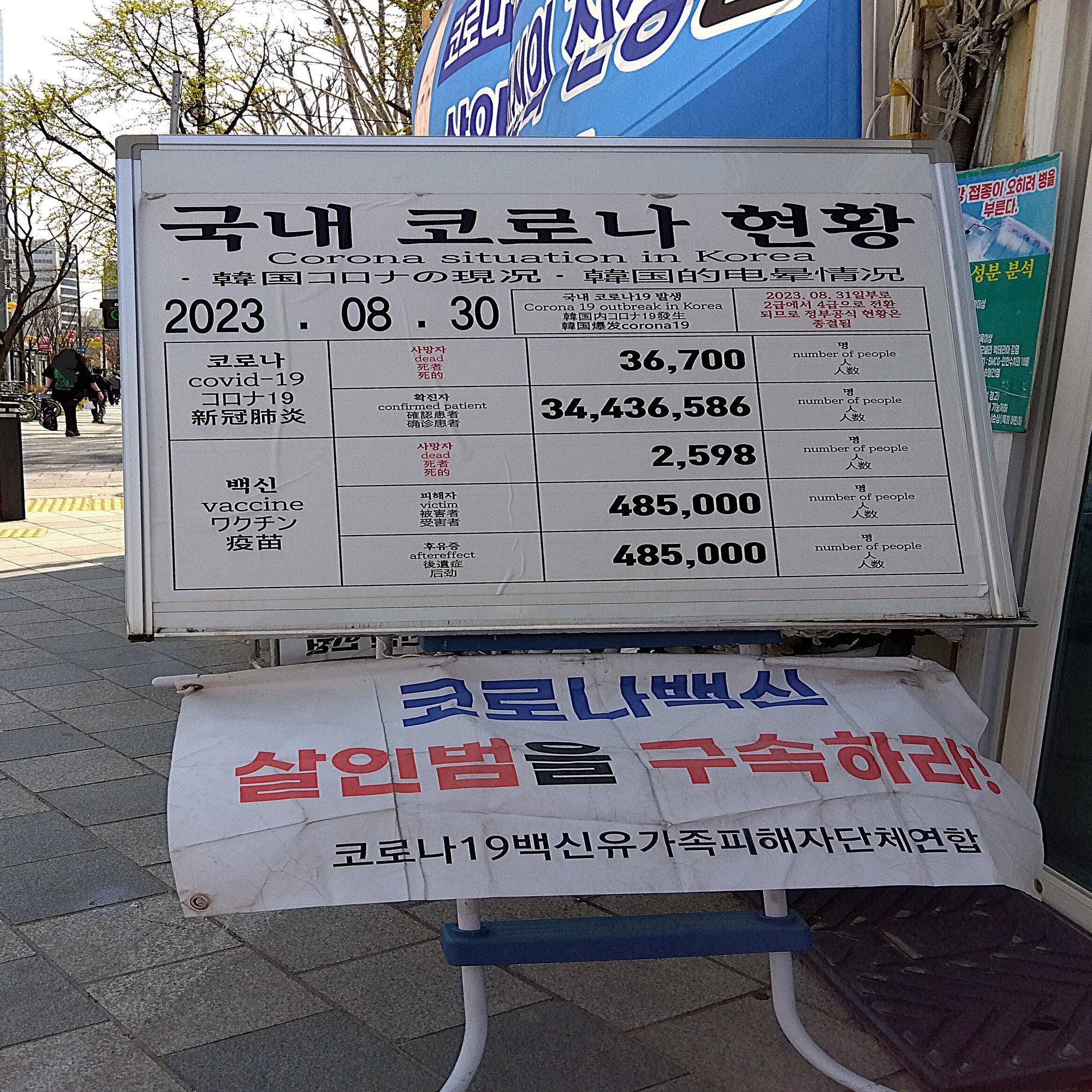 このボードによれば、2023年8月30日時点で韓国国内におけるコロナの死者は3万6700人、感染者は3443万6586人。ワクチンによる死者は2598人、ワクチン後遺症被害者は48万5000人とある。ソースは不明。