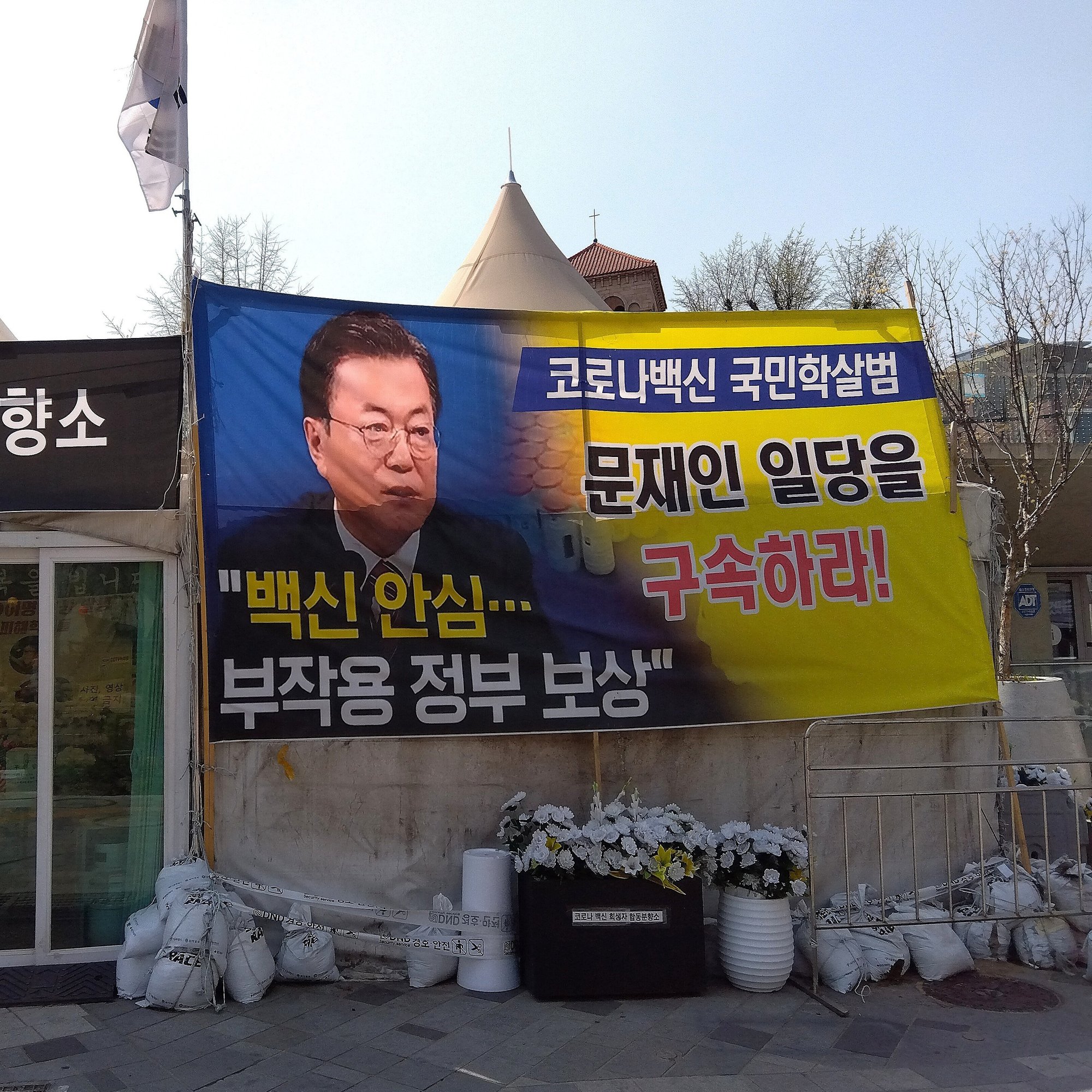 合同焼香所の両脇には大きな横断幕が張られていた。パンデミック当時に大統領だった文在寅(ムン・ジェイン)の顔写真に、ワクチン政策を抗議する文言が添えられている。