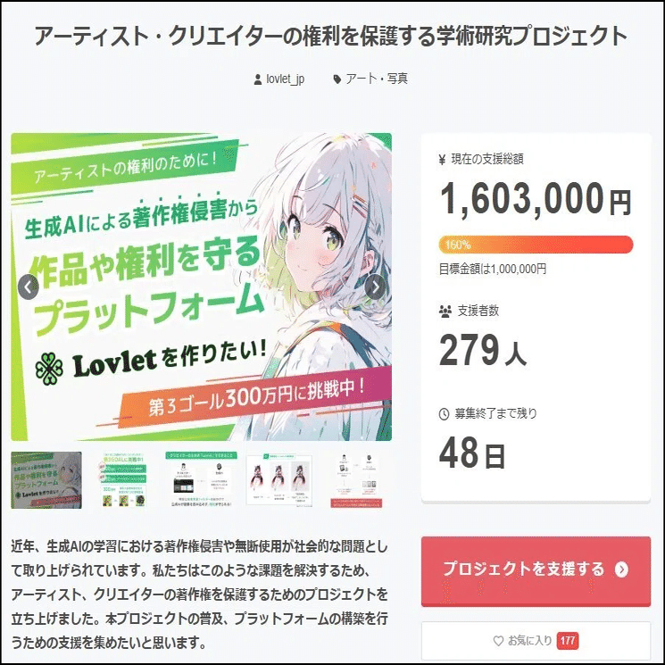 Lovlet運営は生粋の反AIであるため、Lovlet自身がこの画像を使ってページを作る事は、まず考えられない。このページはおそらくCAMPFIREに依頼して作ったと思われる(そのようなオプションがある)。その場合、Lovletは被害者というポジションになる。