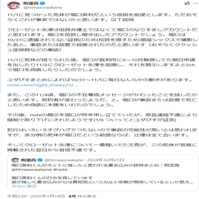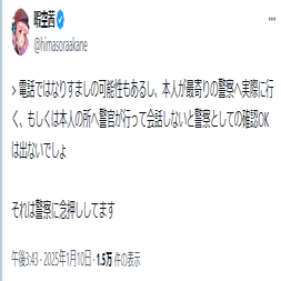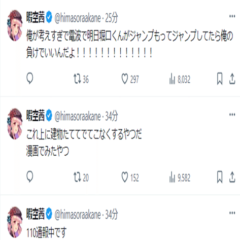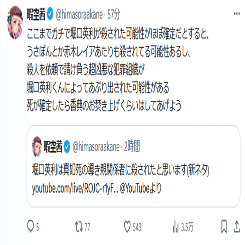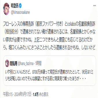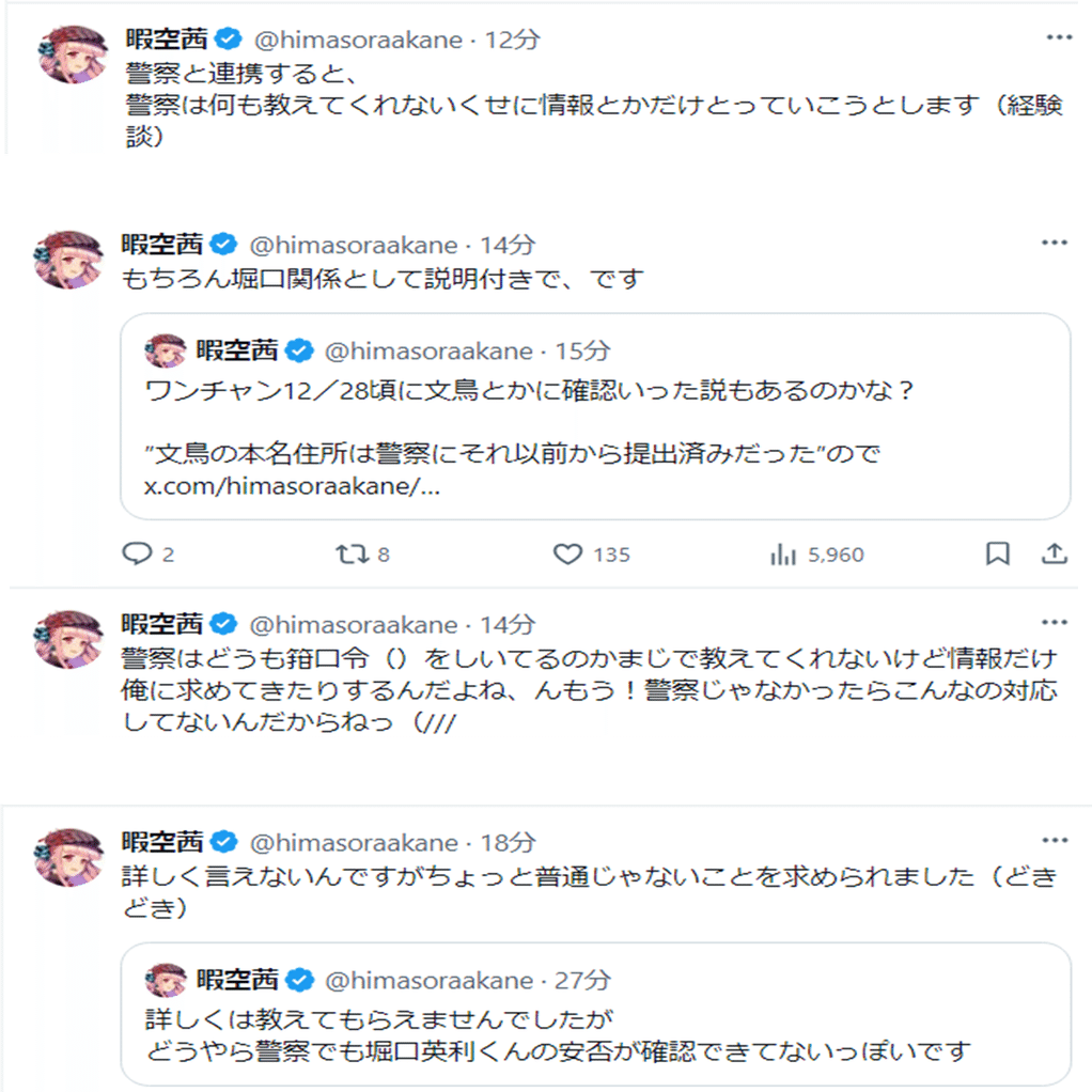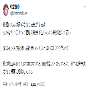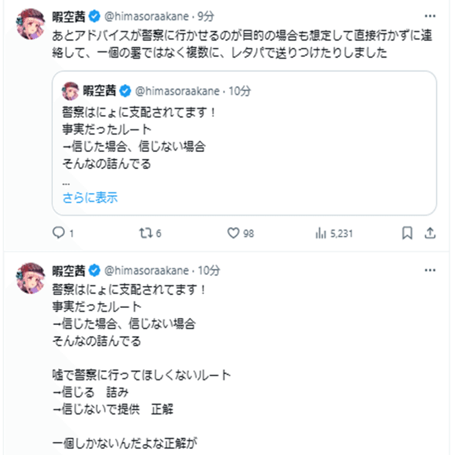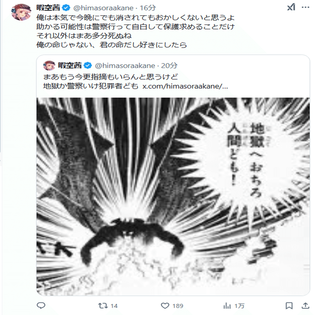 なお、みんなわかっていることだが、殺害予告とみなされていたらとっくのとうに警察動いているよね。前から指摘しているが、暇空がそうやって発信し警察にも得意になって喋っていることが暇空に不利な材料として蓄積されていると考えられる。
