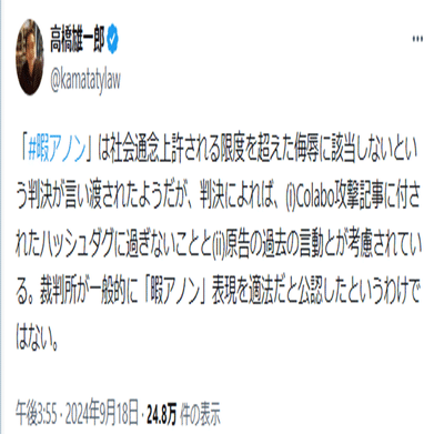 高橋雄一郎はさすがにポストを削除してないかなと思ったけどそのままだった。そもそもさ、「ハッシュタグに過ぎない」という趣旨は判決文にはなくて、「#暇アノン」という「コメント」は「本件特集〔動画〕の主題を表す単語を単にコメントしたものにとどまる」等として侮辱性を否定した上で、高橋の言う単なる「暇空の過去の言動」ということではなく、当該動画で批判されている暇空の言動と密接に関わる暇空の一連の見解に照らして、「暇アノン」という表現の名誉毀損性を否定した。