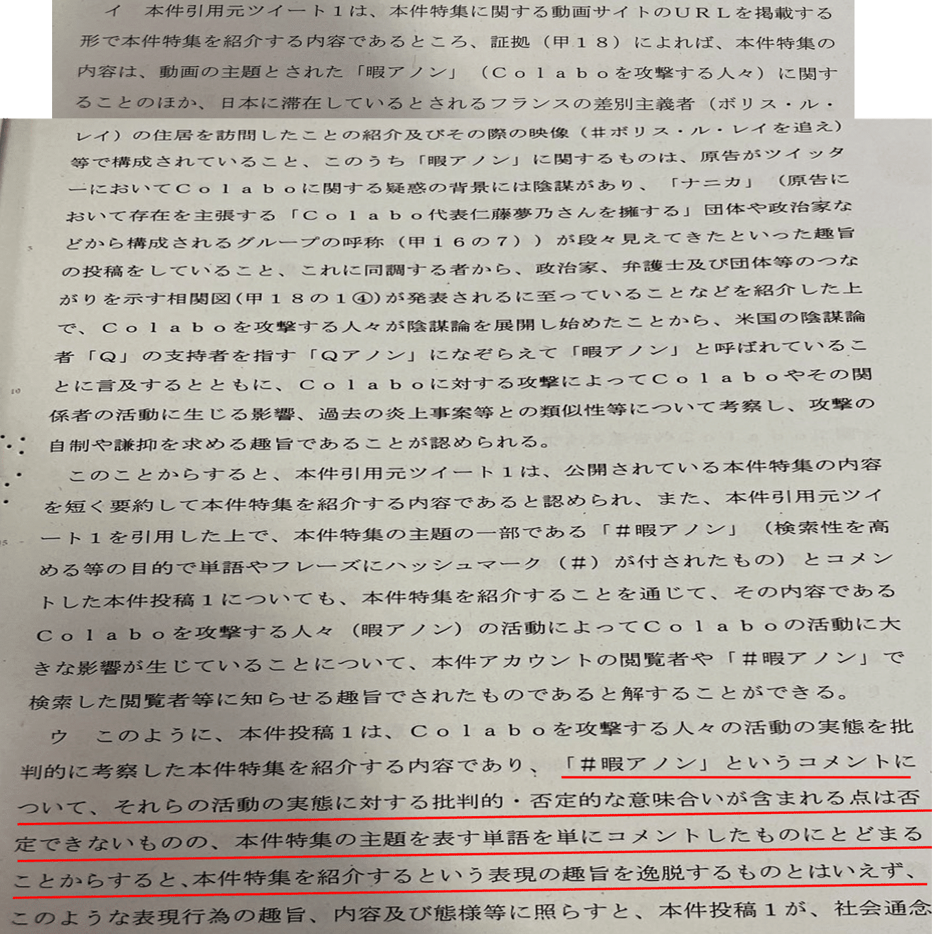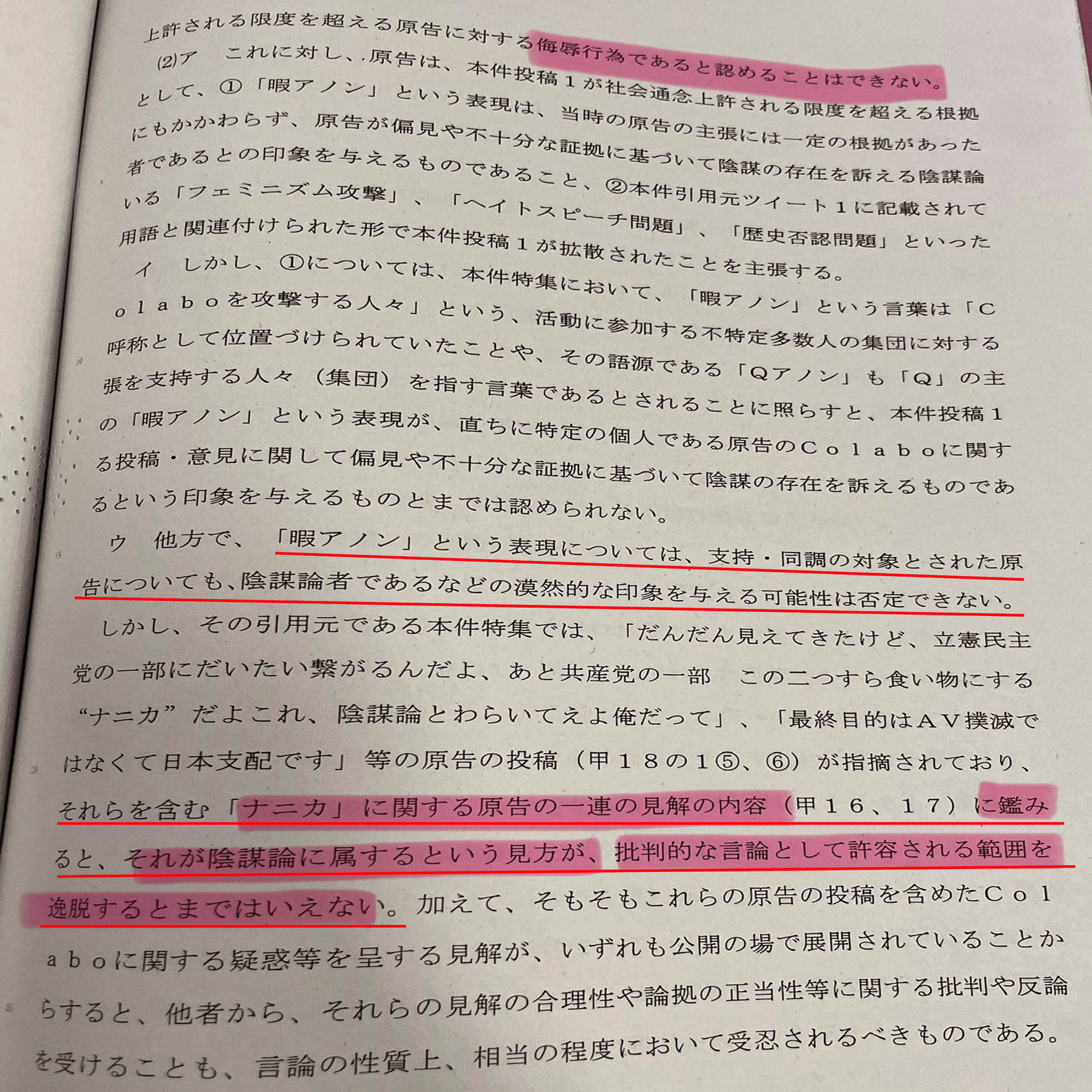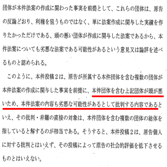 ところで、裁判所が特定の表現を「公認」するしないなんて通常あり得ず、その表現が問題となった場面、文脈において違法性、不法性が認められるかどうかが判断されるもの。そして。むしろ、この判決理由は「暇アノン」という単語、表現そのものとしては不法行為性は認められないとしたものと読むのが自然。