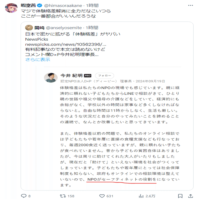 暇空、岡崎らが異常なのは自分たちで選択的に体験格差解消の取り組みに関する情報を拾って並べて騒いでいるだけなのに、「全力」だ「密かに広がる」だ言ってることよ。暇空たちが槍玉に挙げてきた施策、課題のあらゆることについてそう。