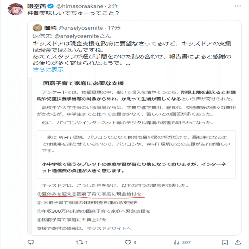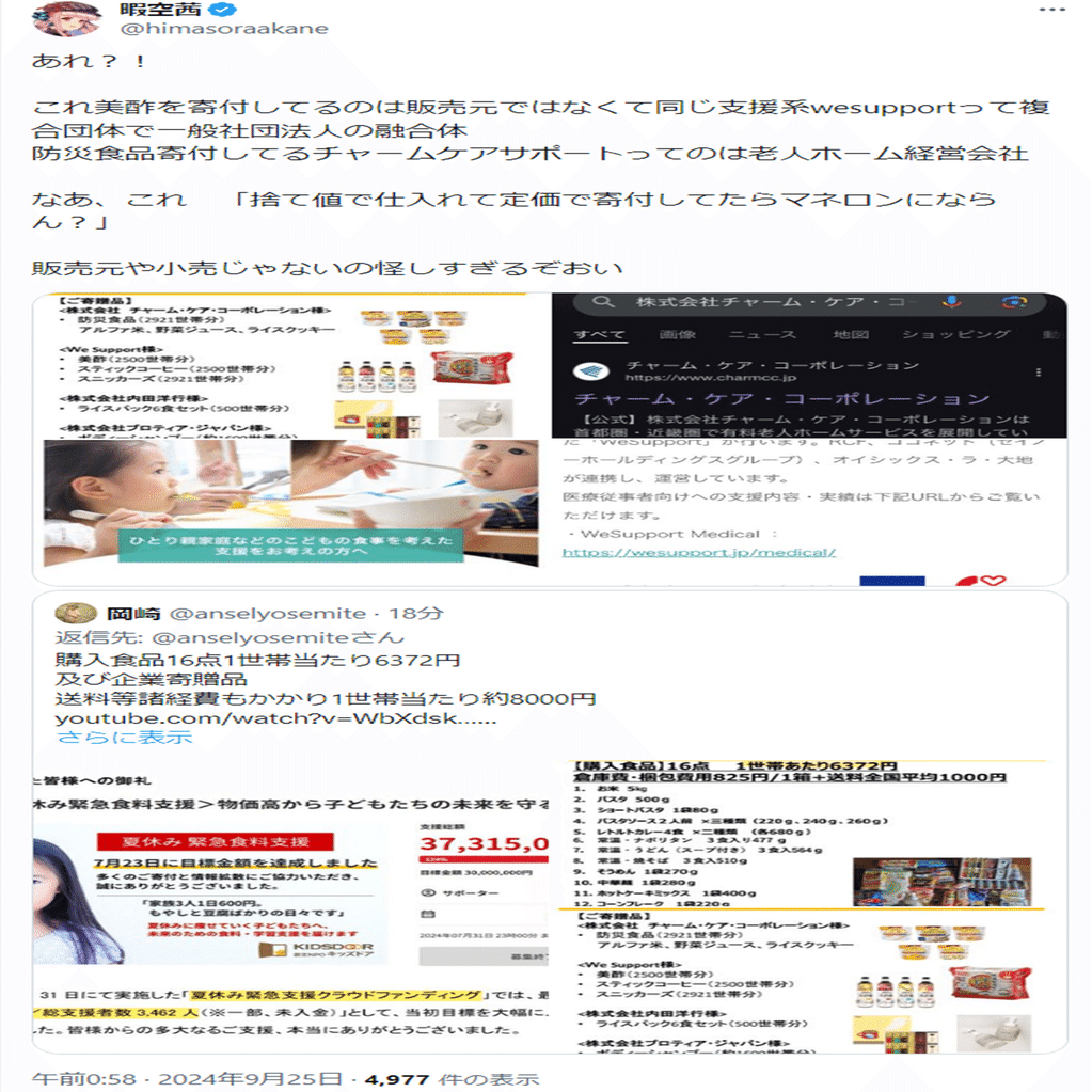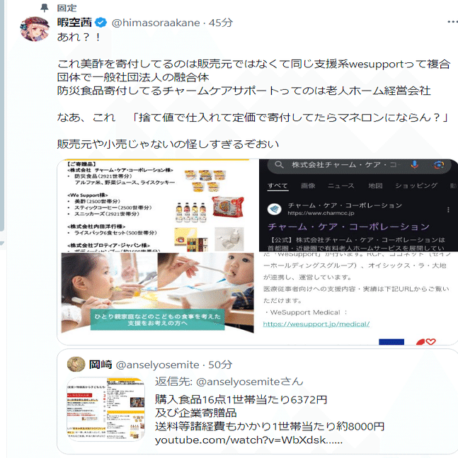 まだ何も理解せず妄想でデマ、誹謗中傷を飛ばす暇空。その暇空にネタ提供する岡崎。企業から在庫品を集め支援団体に分配しているのだろうということは容易に想像できるし、実際WeSupportのサイト見れば一発でわかる( wesupport.jp )。チャーム・ケア( https://www.charmcc.jp/corp/company/sdgs/#Sec03 )は賞味期限が迫った備蓄品をキッズドアに寄付と書いてある。