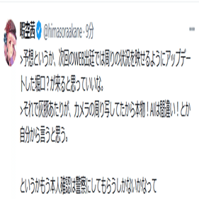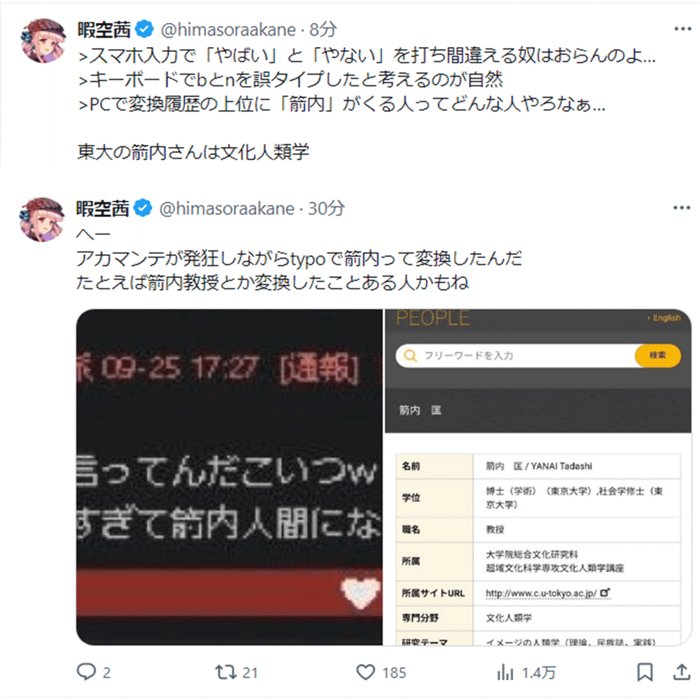 PCで「yanai」で変換してみたら一発目が「箭内」だった。2年弱使ってるこのPCで「yanai」で変換した覚えはないし、ましてや「箭内」は絶対に入力したことない。(ユニクロなどの)「柳井」が出るかなと思ったんだけどね。そもそも、「~やない」はともかく、「やない」だけで変換することは少ないよね。暇空の認プロだかカン、推理だかってほんとこのレベル。現れるのは暇空自身の認知、心理、願望でしかない。