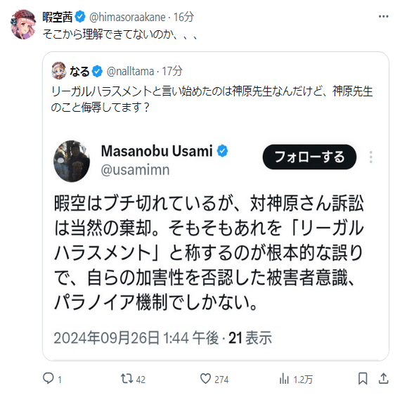 繰り返しながら、暇空の加害者認知からの被害者意識のレトリックでしかない。「リーガルハラスメント」の誤用でしかないし、都合よく「一般人」って使ってんじゃねーよ。権力(パワー)を動員し振り回しているのは暇空の方。 pic.twitter.com/u1p7mymreb