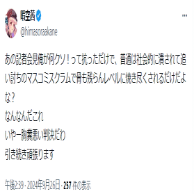 おぎの稔もそうだが、ほむらとかホットケーキとか暇空と直接リンクしなくなった者たちのミソジニー、差別性も相変わらず醜悪。結局暇空から離れてもそれで自らを省みたものはまずいない。全く知らんぷりであれ、「公金追及は間違っていなかった」と言うのであれ、一見女性支援団体叩きも批判するのであれ、さらにはアンチ暇空に転じたのであれ、自らのミソジニー、差別意識と向き合ったと見える者は見受けられない。