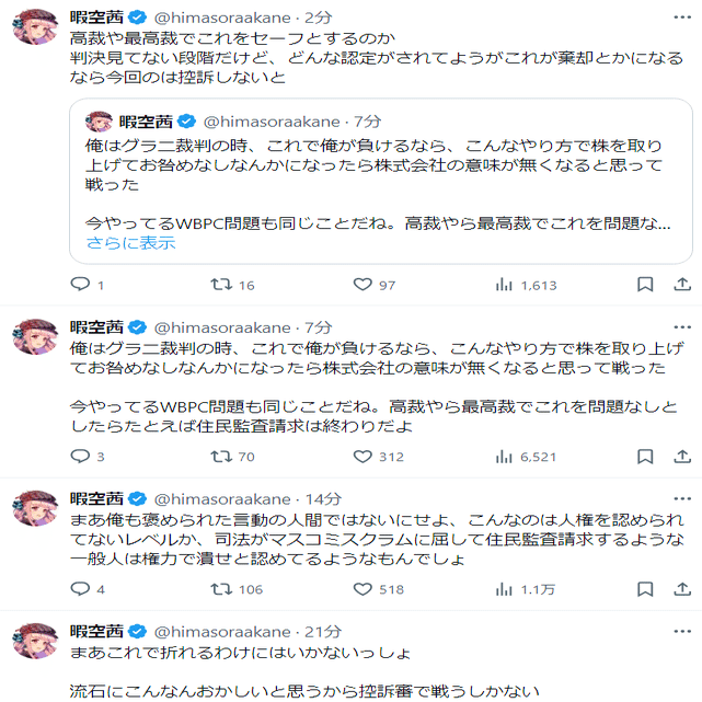 対Colabo・仁藤さん、太田さん、神原さん、のりこえねっと、伊藤さんという暇空問題のコアの部分でも、全く別筋だが暇空の主戦場と化している対堀口さんでも完敗を重ねている。対新橋九段さんでも、Colabo、太田さんとも絡む例のポストについては完敗。