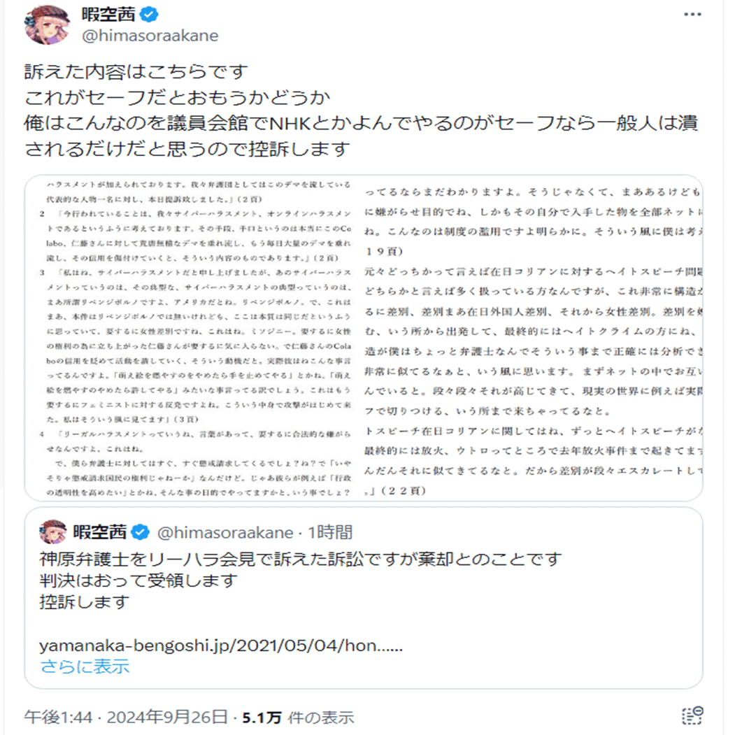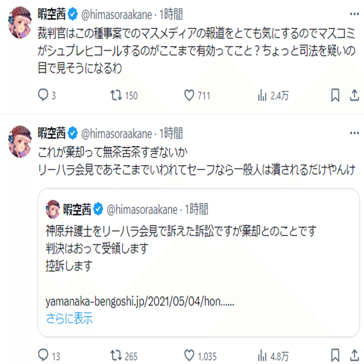 暇空はブチ切れているが、対神原さん訴訟は当然の棄却。そもそもあれを「リーガルハラスメント」と称するのが根本的な誤りで、自らの加害性を否認した被害者意識、パラノイア機制でしかない。