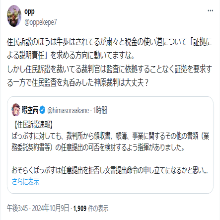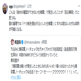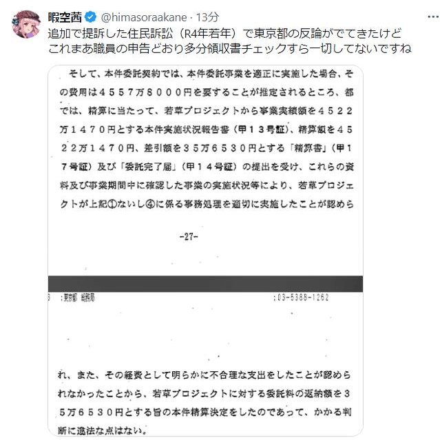 要は住民訴訟で新しい問題、疑惑、矛盾など何一つ出てきていなくて、監査時点で確認されている事実あるいは容易に推測できた事実が並んでいるだけ。暇空、なる、opp、nobuhiko部屋、red、岡崎、若草ミドリらが誤読・誤解し、自分のストーリーに乗せて一々騒いでいるだけだし、それも何巡目よということ。