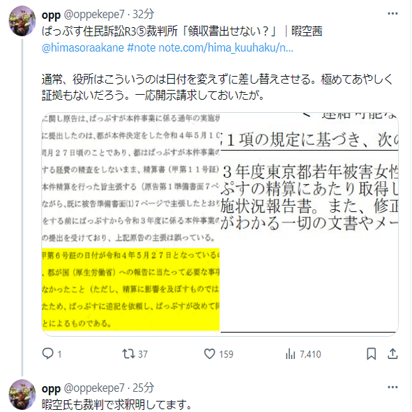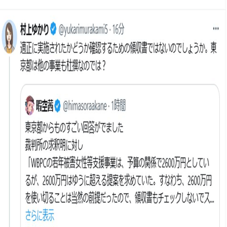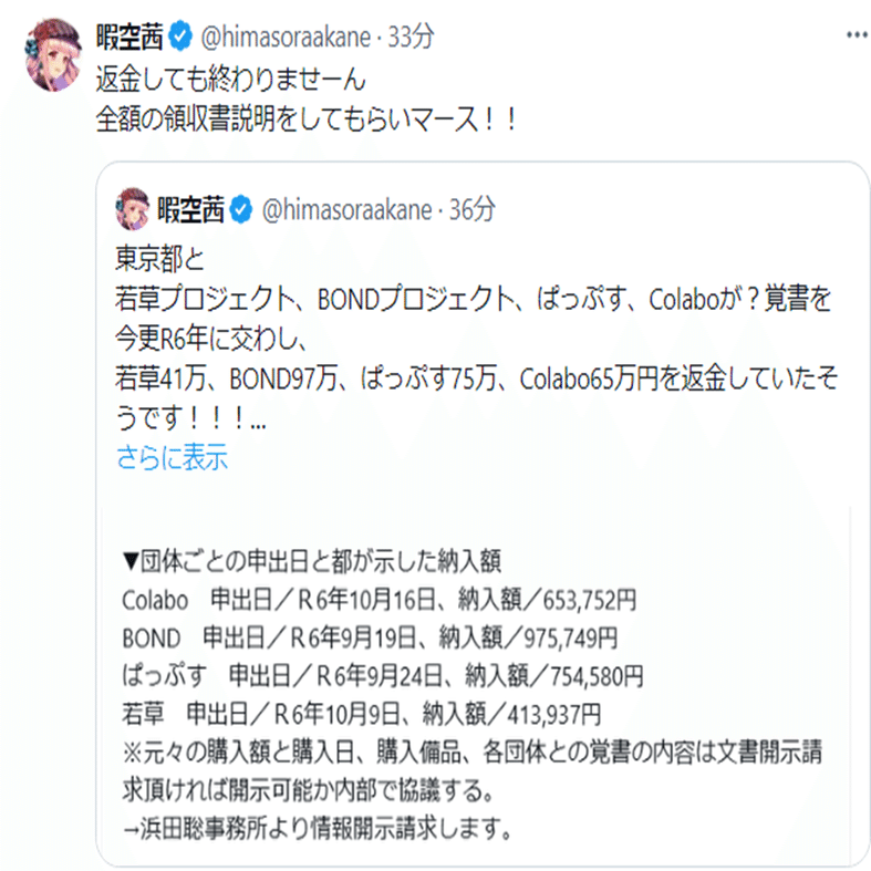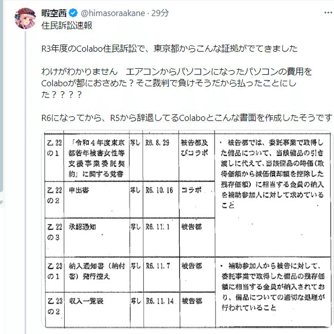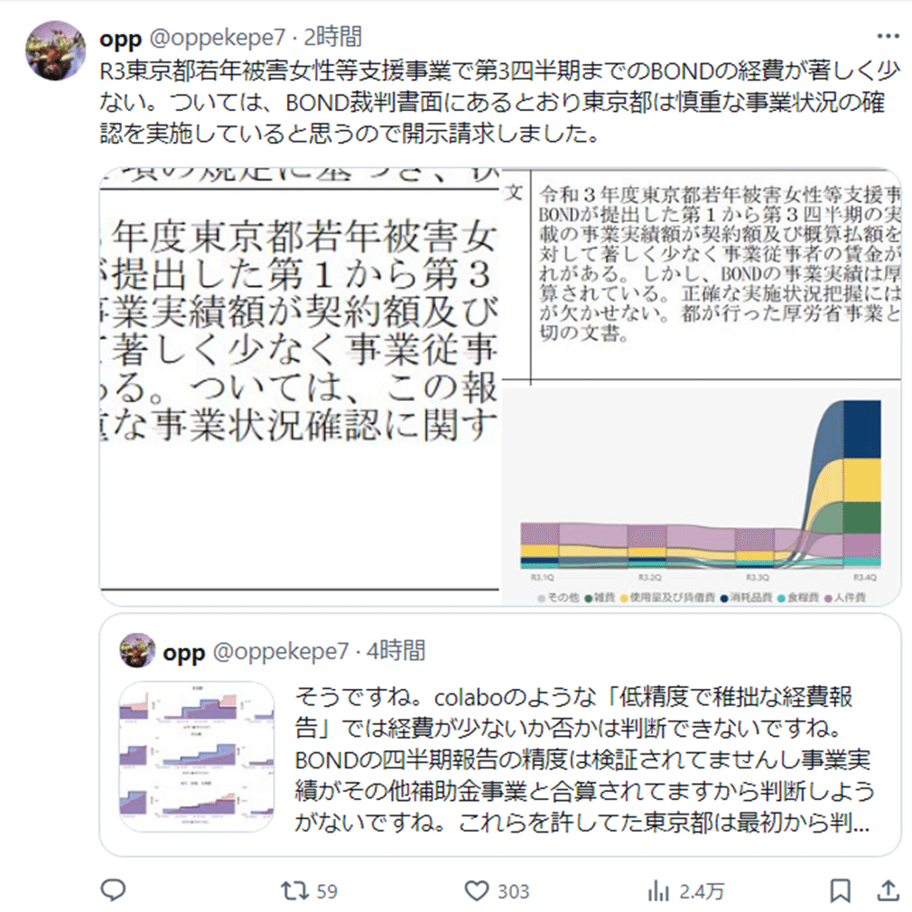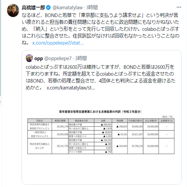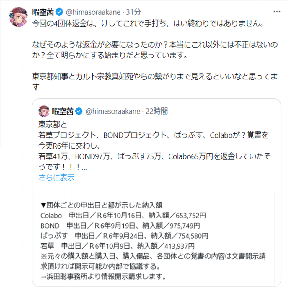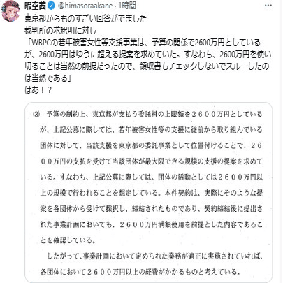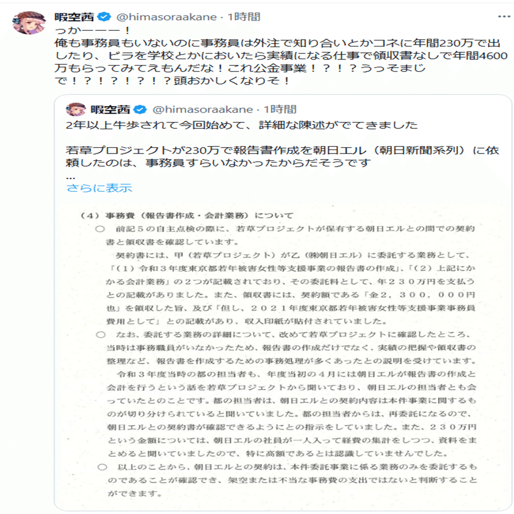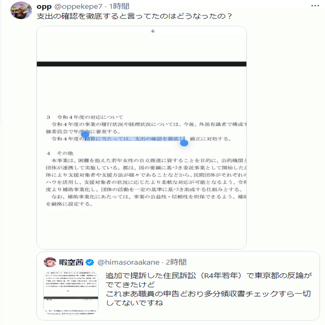 何度でも言うけど、暇空問題は全く終わっていなくて、どの団体も正常化と被害回復の緒にもついていなくて被害発生、影響、負担は現在進行形。もちろん、若年女性・少女など当事者にとっても。各官庁も住民訴訟、開示請求、問合せ・照会などへの対応で業務に支障が生じ続けている。そして、暇空らに倣ったような動き(支援・NPO叩き、開示請求等の濫用など)も広がっている。暇空の敗戦処理のようなフェーズでは全くないんだよ。