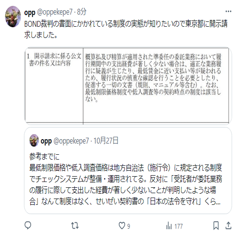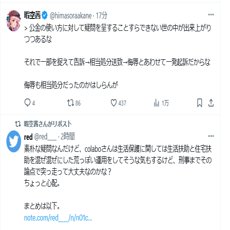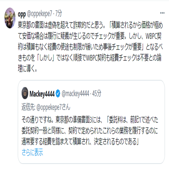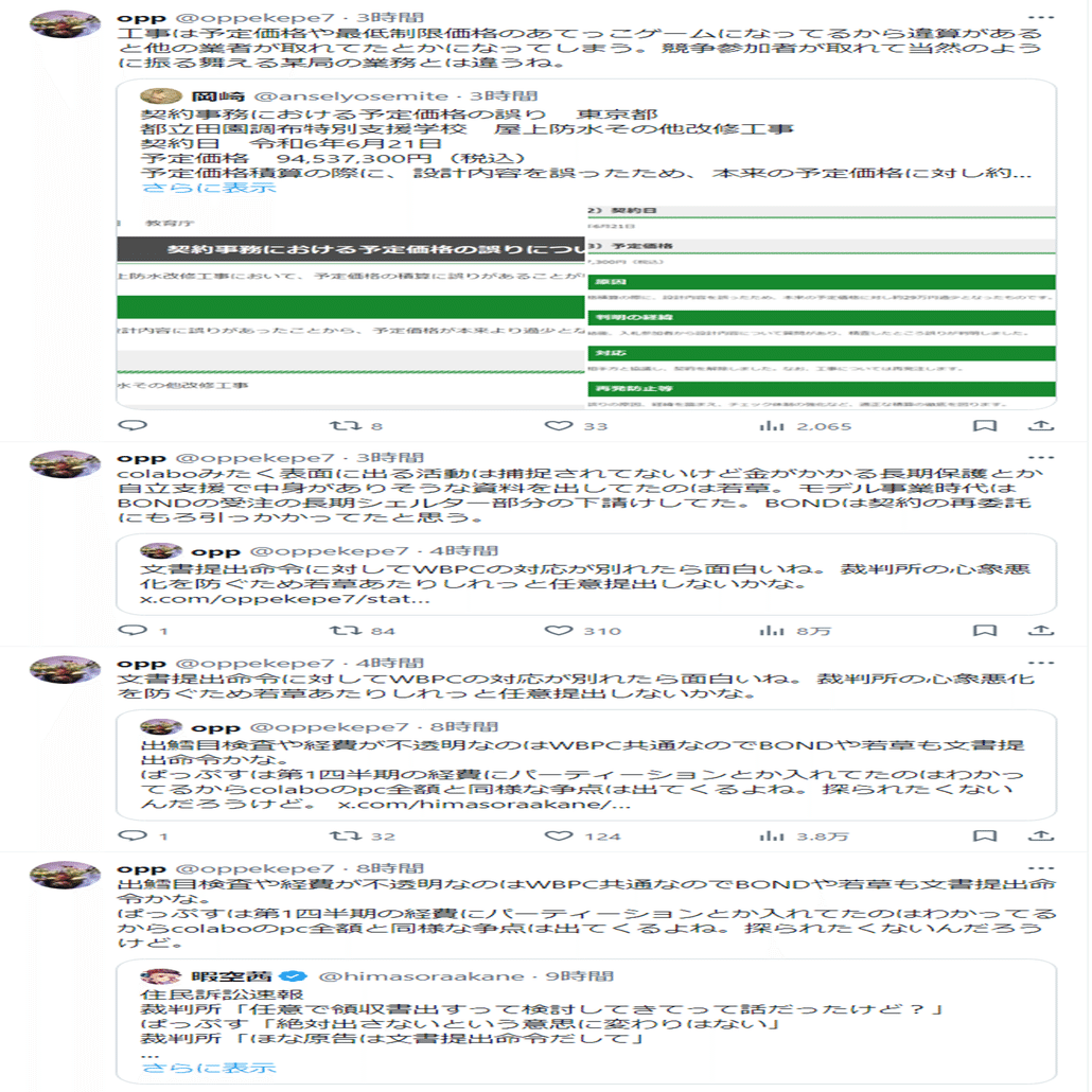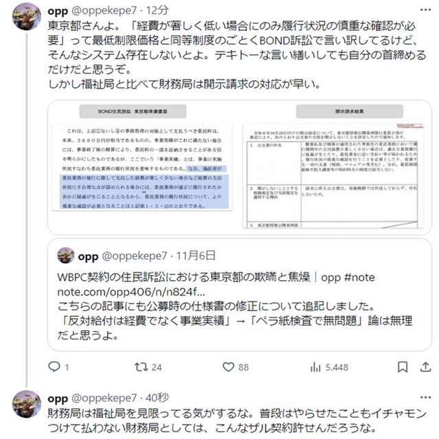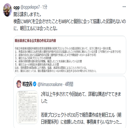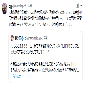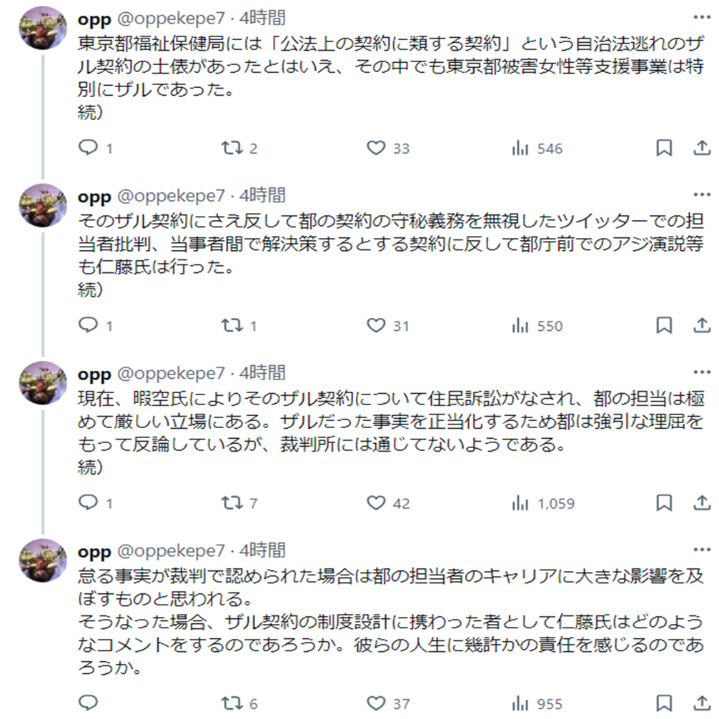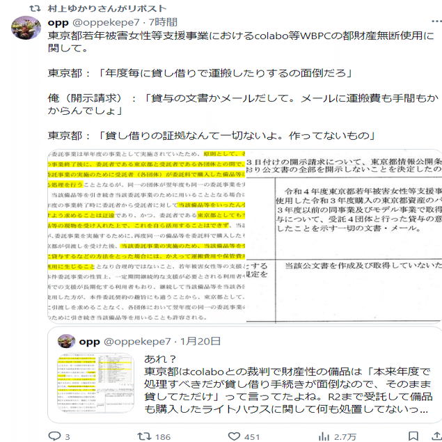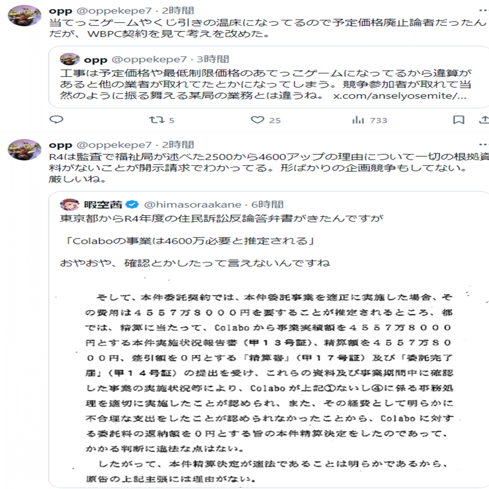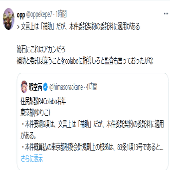 個人情報の件しかり、都とColaboの間のコミュニケーションの問題等々の事情も踏まえて事態を理解しなければならないし、都の担当者も3団体も暇空問題を踏まえたコミュニケーションを取っている訳だよ。そういったことをopp、redらも、絡んでいってる側も、勝手な仮定を立ててやり合ってるから総体として明後日の方向に行っている。