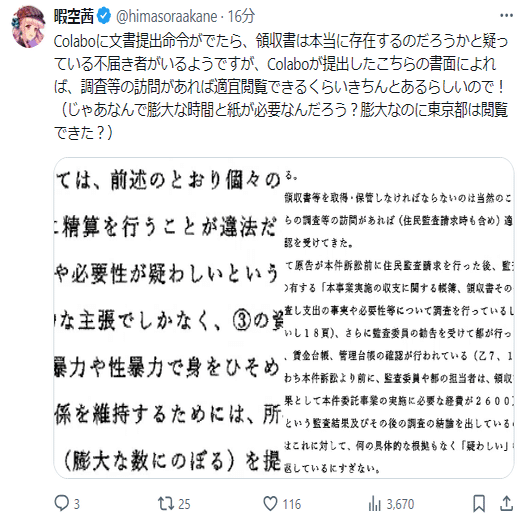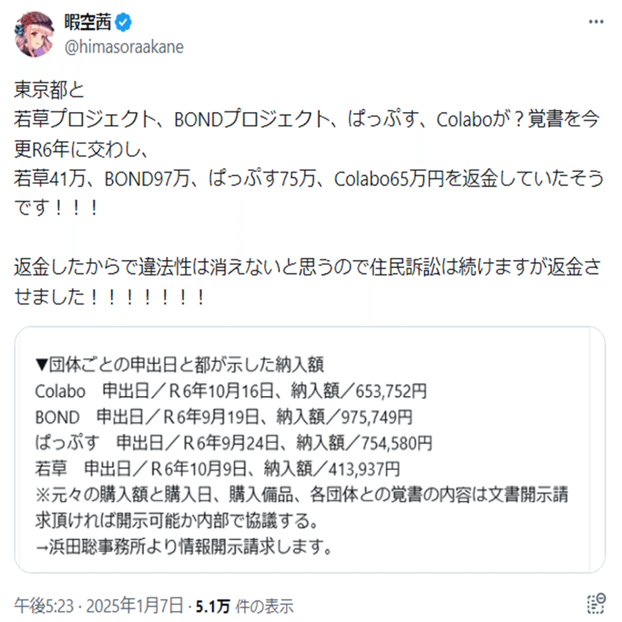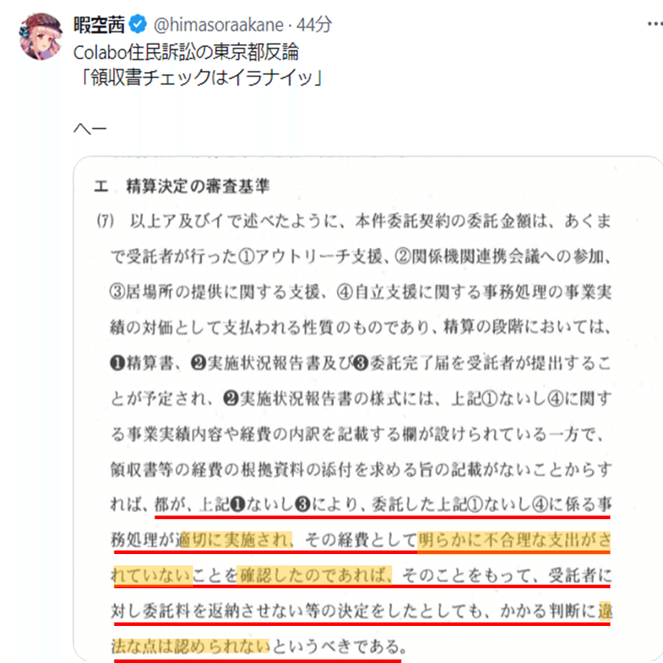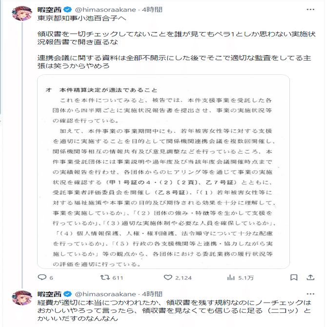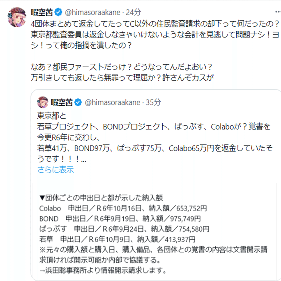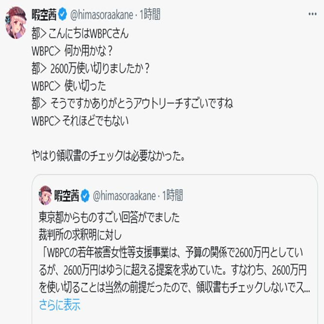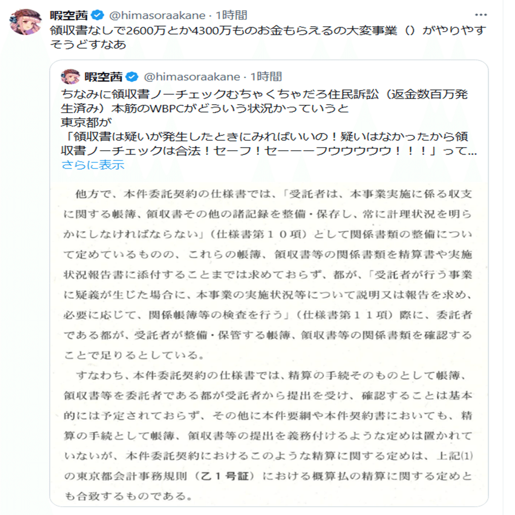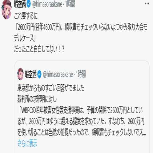 結局は、「自分の気に食わない活動に公金を使うな」「自分の気に食わない団体に公金を使わせるな」ということでしかない。暇空らはそのためだけに延々住民監査請求、住民訴訟で見当外れの主張を重ねて時間を浪費させ(しかもそれを都側の「牛歩」だと顛倒させる)、どんどん妄想を膨らませ、こういった全てを垂れ流し、甚大な被害と犠牲をもたらし続けている。