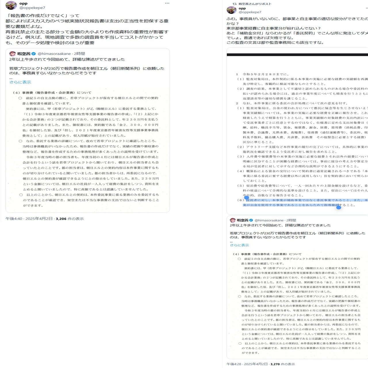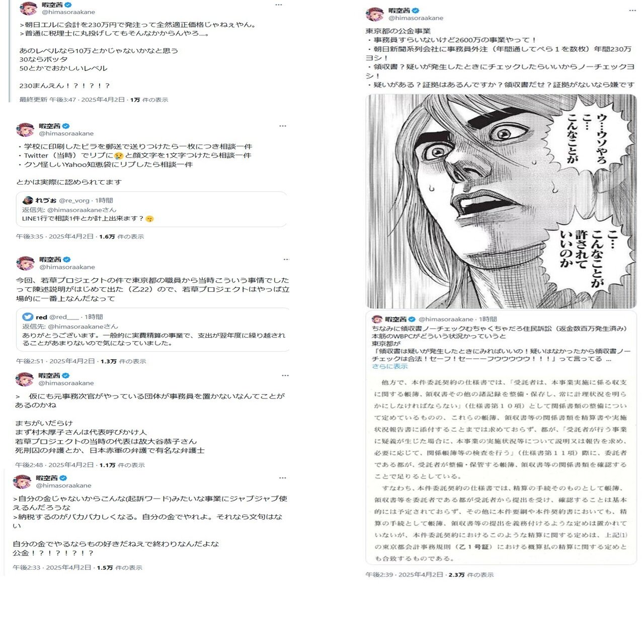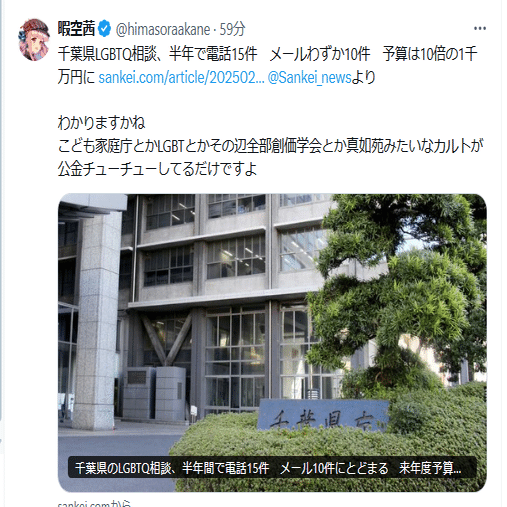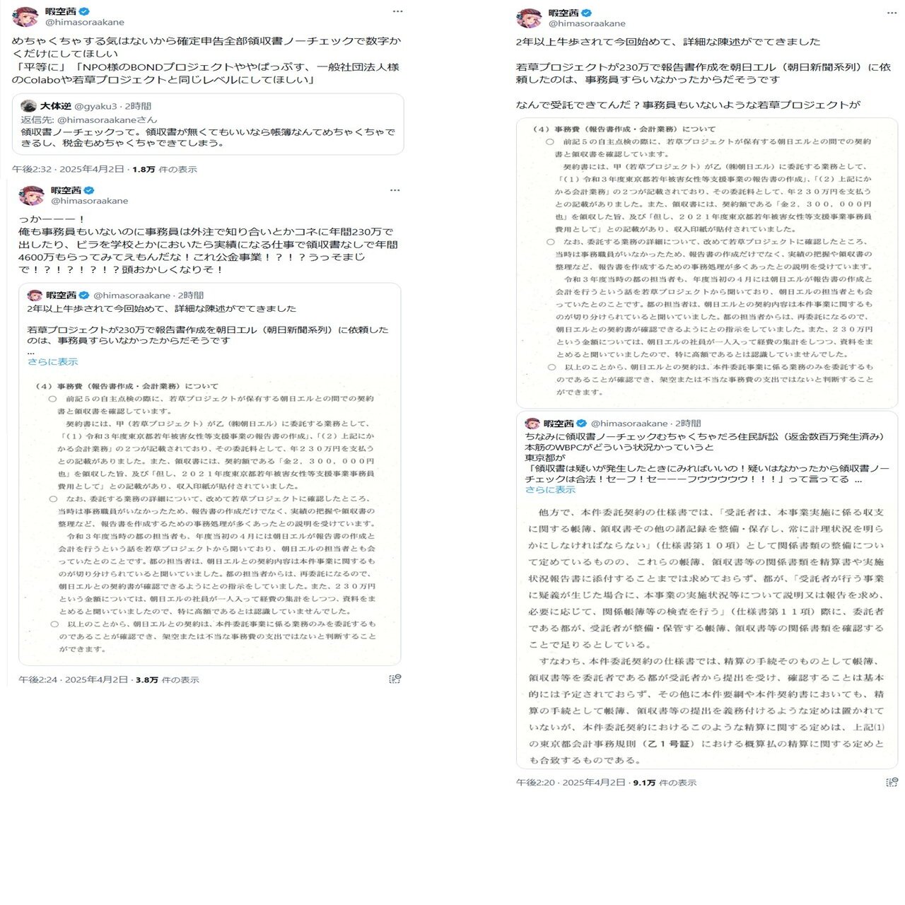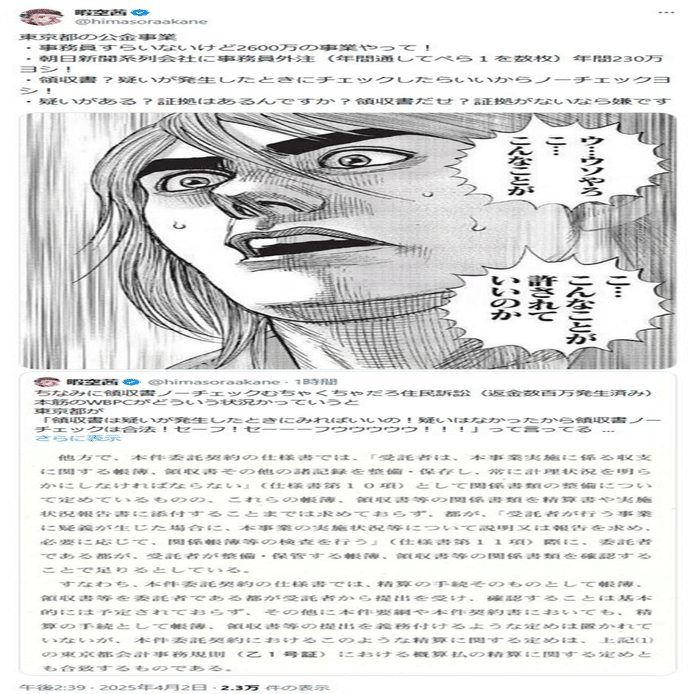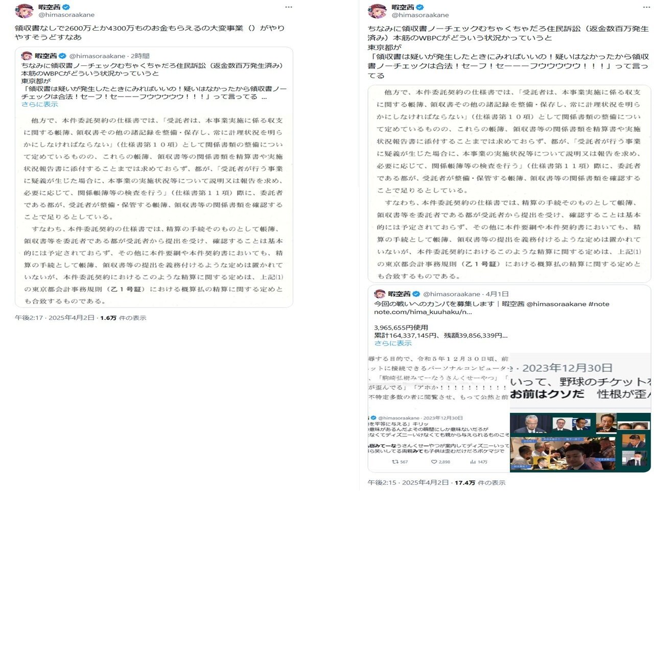 結局は、「自分の気に食わない活動に公金を使うな」「自分の気に食わない団体に公金を使わせるな」ということでしかない。暇空らはそのためだけに延々住民監査請求、住民訴訟で見当外れの主張を重ねて時間を浪費させ(しかもそれを都側の「牛歩」だと顛倒させる)、どんどん妄想を膨らませ、こういった全てを垂れ流し、甚大な被害と犠牲をもたらし続けている。