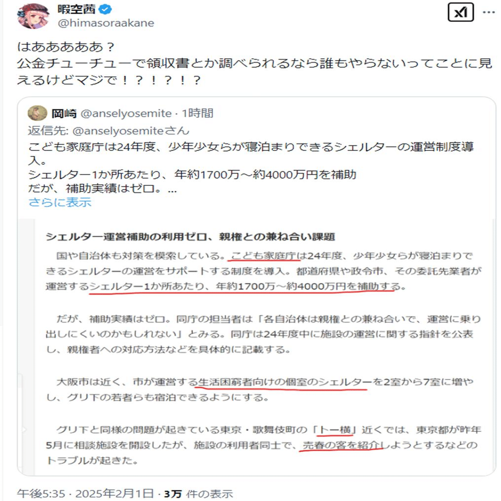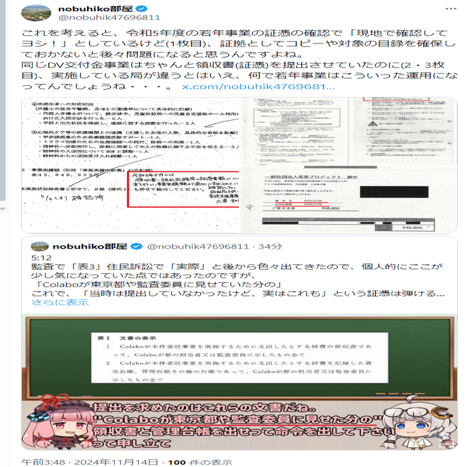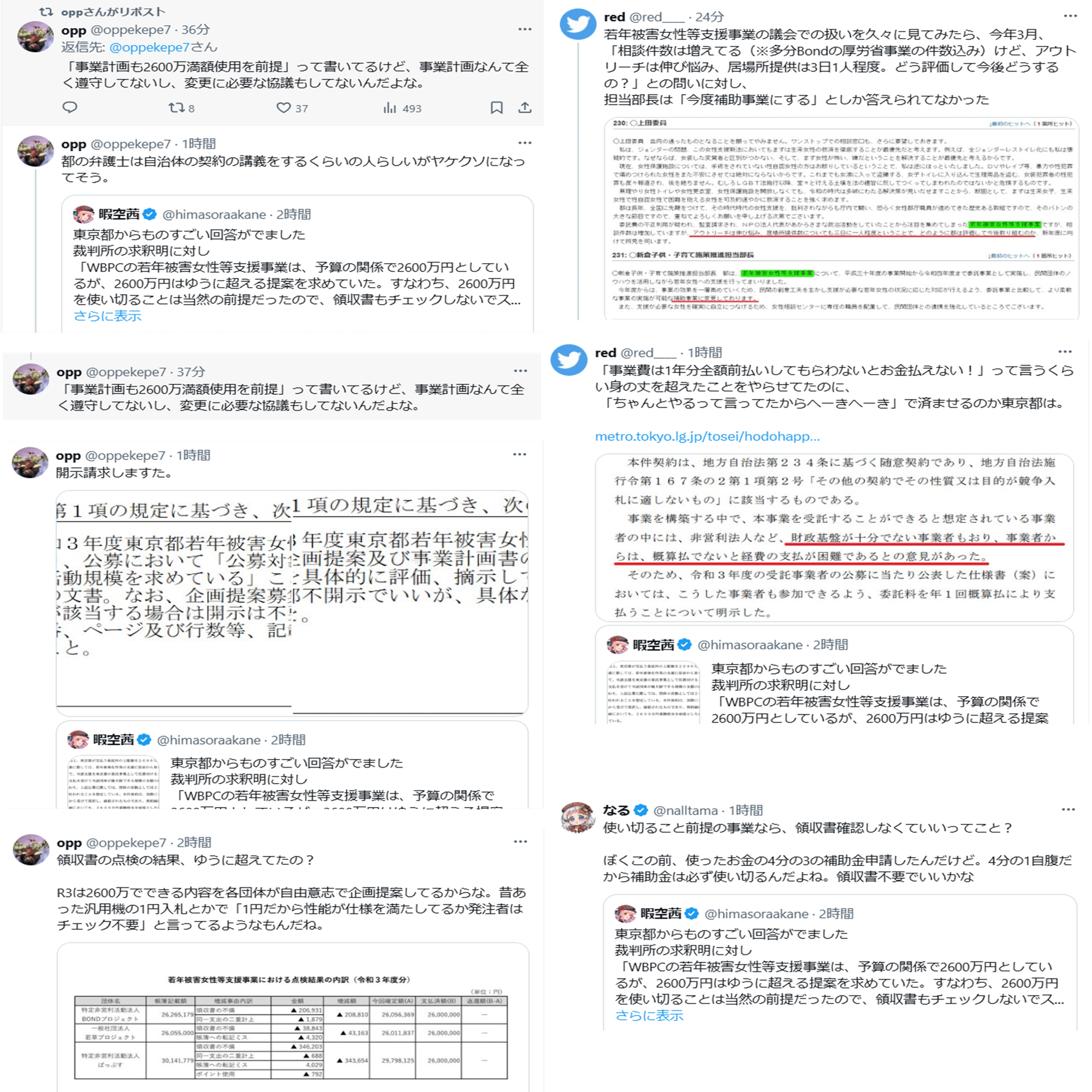 暇空もopp、nobuhiko部屋、red、岡崎、岡崎、若草ミドリらも、Colaboを叩くということから若年被害女性等支援事業に目をつけ、叩くことを正当化、合理化するために、「不正」ストーリーが通らなくなっても延々ケチ付けを続け、悪意・故意ではなく過失のレベル、事務処理を巡る解釈の違いレベルのことを針小棒大に騒いでいる。
