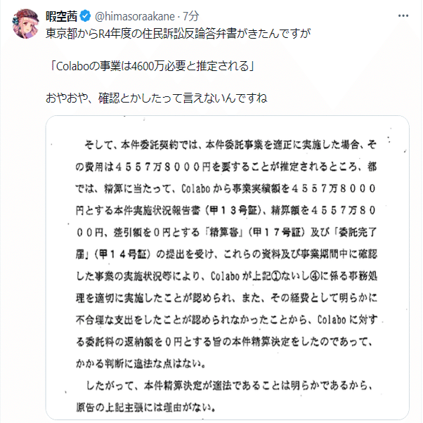これも繰り返し言っていることだが、都は速やかに住民訴訟の棄却判決を得て、暇空らに損害賠償請求をするフェーズに移るべきなんだよ。同時に、名誉毀損罪、信用毀損罪・偽計業務妨害罪等での刑事告訴等も速やかに。受け身の対応は誰の助けにもならない。