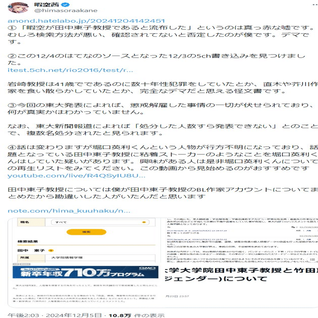 「ミルージュさんではない」「堀口英利との接点はない」などシンプルに否定できちゃうことばかりだからね、暇空が田中東子さんや東大、その周辺について言ってきたことは。妄想の数珠繋ぎであることは他の人、組織に対するものと同型だけど、些細な事実に妄想をかぶせたというものですらないから、〈ミルージュ≠田中東子〉という単純な事実一つで残り全てもひっくり返ると言っていいぐらいだし、派生してひっくり返るストーリーは結構あるよね。
