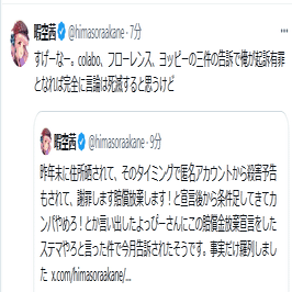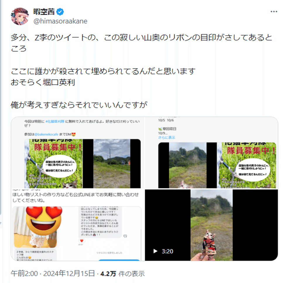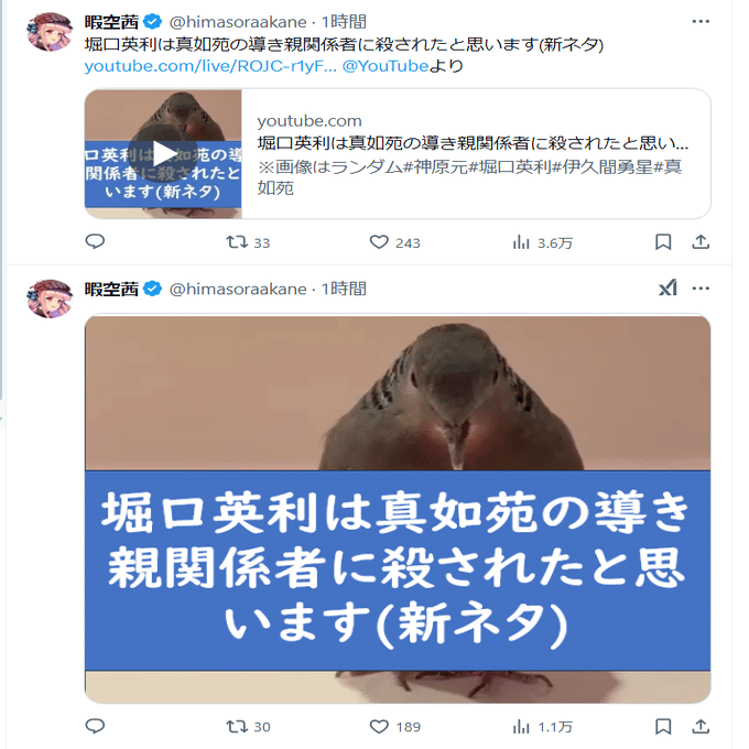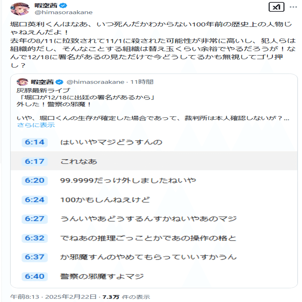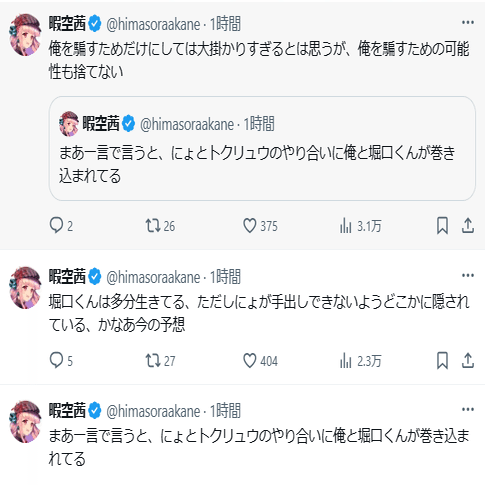 要はさ、堀口、灰豚等々の訳の分からない行動に暇空が妄想で訳の分からない意味付けをし、訳の分からないストーリーにして、それにまた訳の分からない行動で対抗して…の無限スパイラルでしかないのよね。そこに無関係の第三者が次々と巻き込まれて大変な被害が方々で発生している。