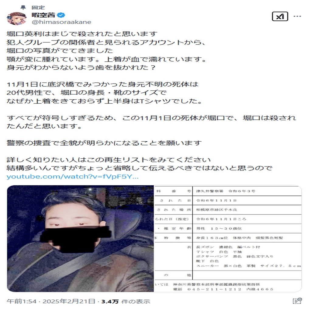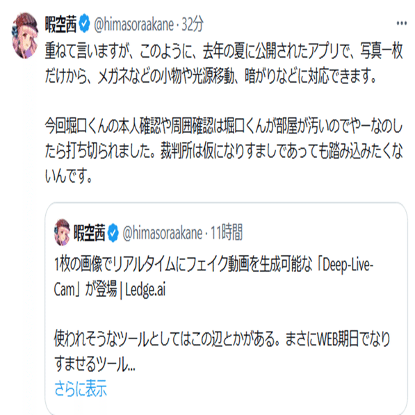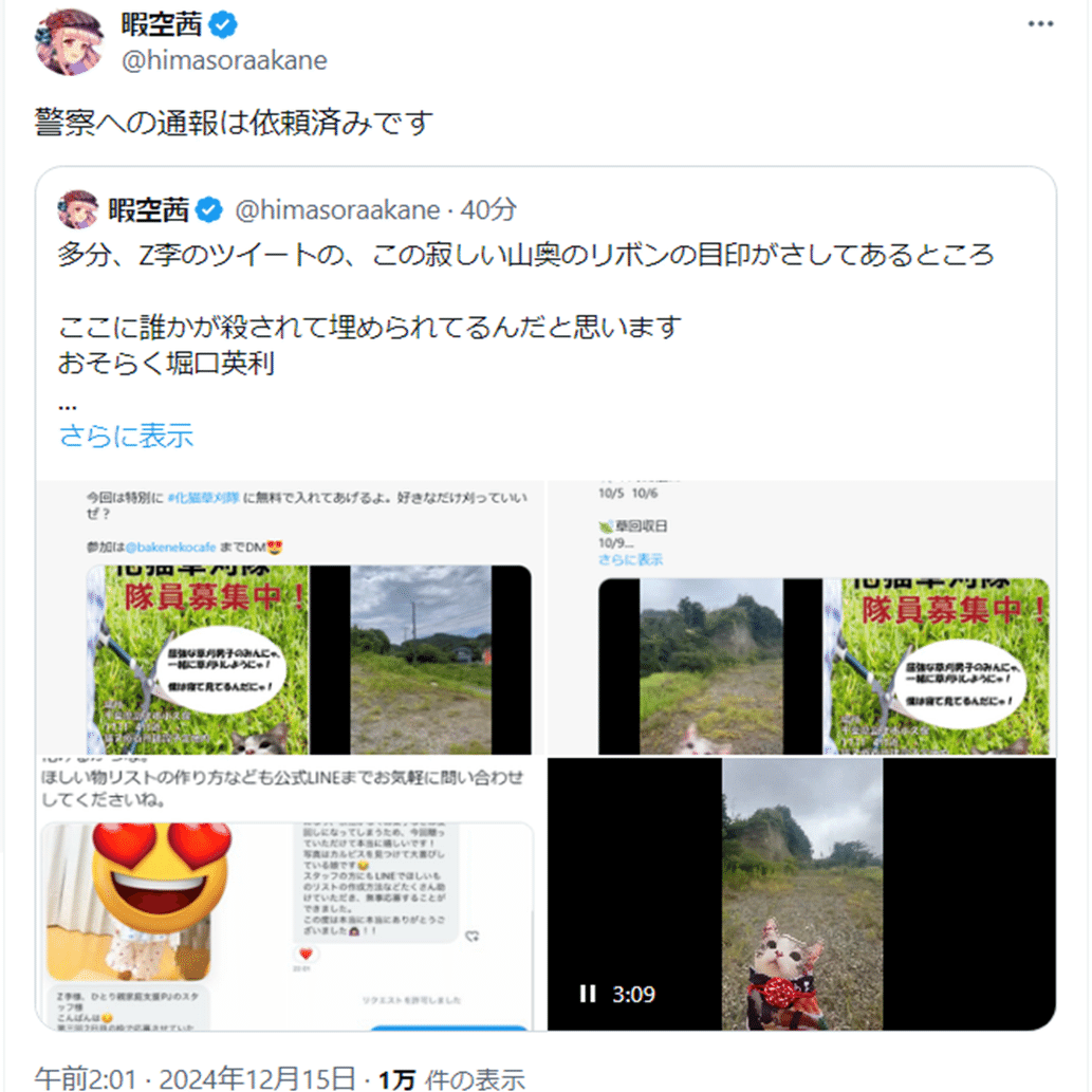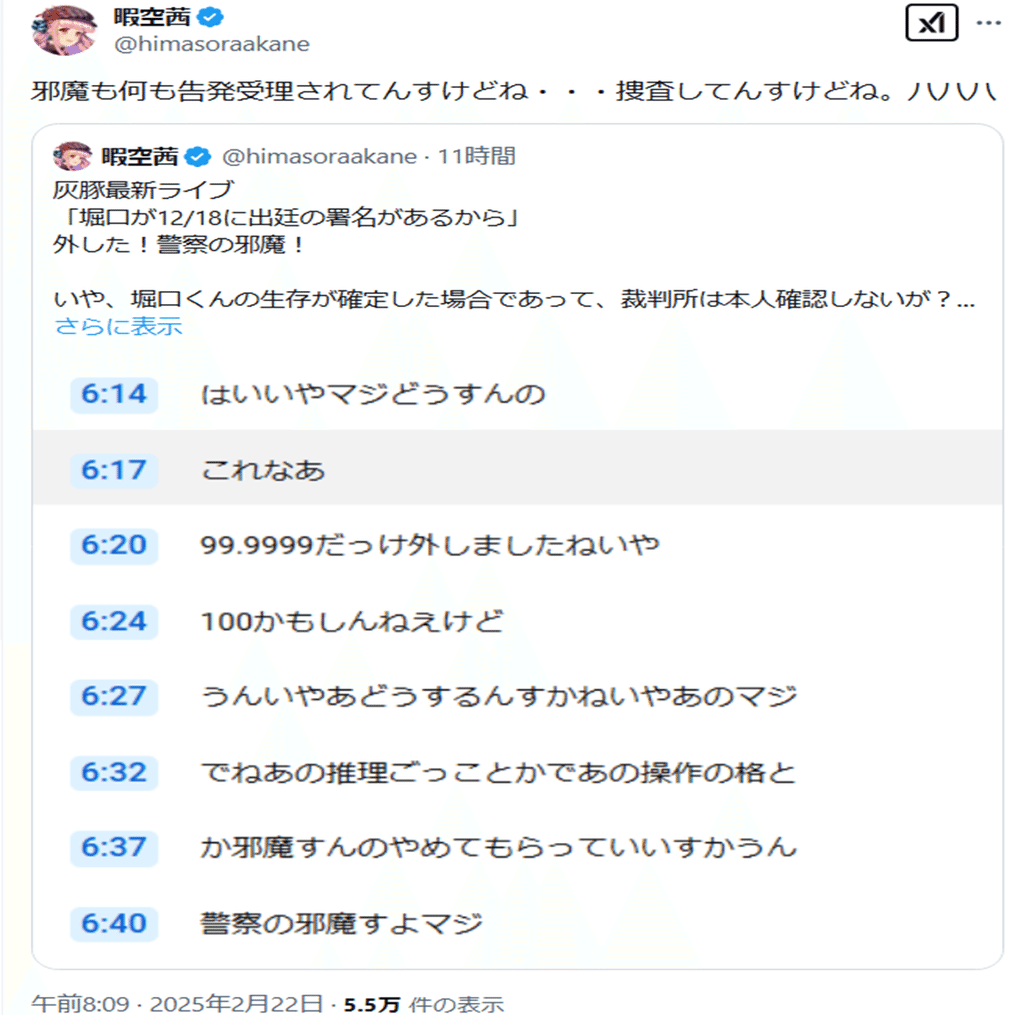それで堀口とは無関係な、あるいは接点があるにはあるけどという程度の第三者が延々と被弾しているし、そうした第三者のことも暇空が弁護団と一緒になってせっせと警察に通報したり資料提出したりしている。名誉毀損、侮辱、信用毀損、虚偽告発等などどれだけ違法行為を重ねているんだってこと。だから、今は堀口、灰豚、神谷らは余計な動きをせず警察の捜査の進展を待つべきなんだが、これまでもさんざん妨げになることをしてきてしまってて聞く耳持たないからどうしようもないのだけど。