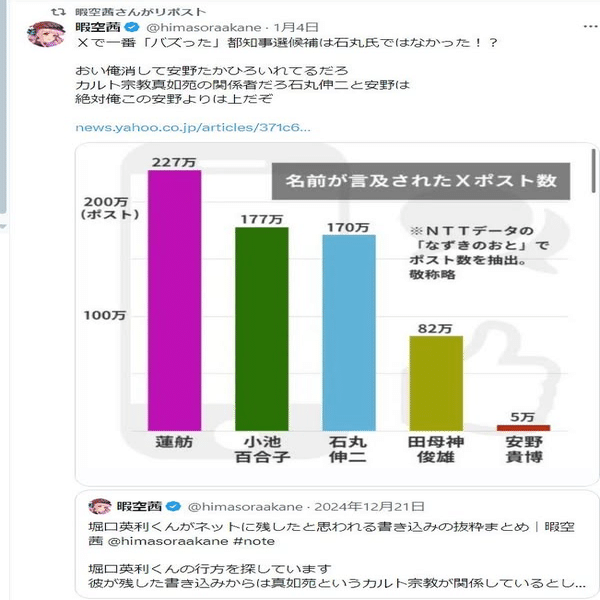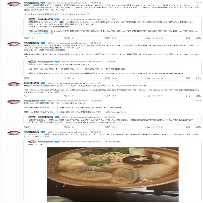何度も言ってるけど、全部暇空発で、堀口にも暇空から絡んでいったんだよ。ただ、それに堀口が不用意に応戦してマウント取ろう、叩き潰そうとしてしまったのがミスではあって。そこに暇アノンが大挙して乗っかっていって暇空がどんどん妄想を膨らませて誹謗中傷を重ね、アンチ暇空も主戦場のように乗っかっていって堀口を持ち上げ、煽りすらしてしまった。それもまた暇空の妄想に取り込まれで、今やそういったすべてが暇空の中で合流して壮大な妄想、陰謀論になり、全てがそれを補強する材料にされてしまっている。