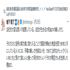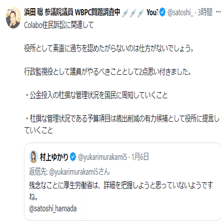 村上ゆかりが浜田聡の秘書を辞めるそうだ。訳わからないので追うつもりはないが事務所内外で揉め事が起こっている模様。これで浜田がおとなしくなるとはもちろん思わないが、「アニマルズ」等とのパイプ役にもなっていた村上が去ることで暇空問題に関わるおかしな動きが少しでも減れば。