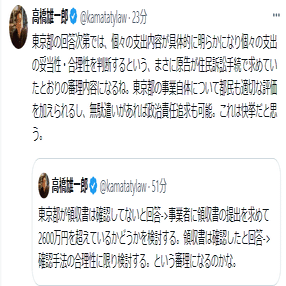 そして、〈仮に指摘通りの事実があったとしても〉住民訴訟で争うべき違法の問題に該当しないどころか、不当の問題にすらならない(瑕疵の治癒ということを含め)。それをまた持論に乗せて「悪意」「知識・理解不足」「いい加減」「ザル」といったストーリーにするのだが、それは再帰的、循環論法に過ぎない。