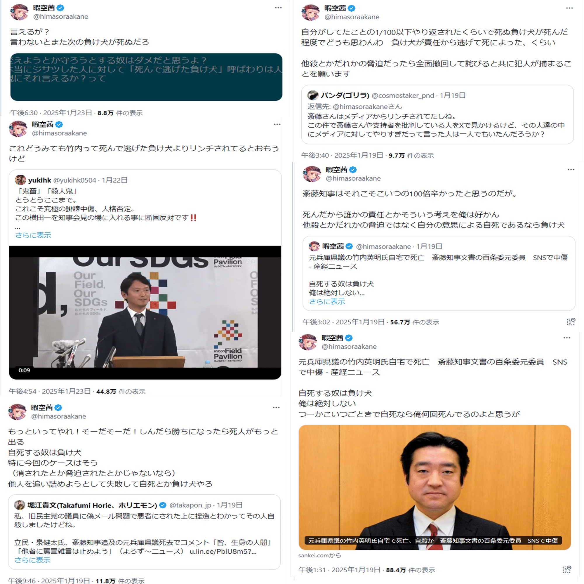 政治・行政、特に小池都知事と都庁が受け身で毅然とした対応をせず暇空を自由にさせている間に、アンチ暇空も余計な絡み方等をして加害言動を引き出すという負のサイクルも回ってしまっていて、何もいいことがない。当の被害者はこの状況に耐え続けている訳で、小池知事・都庁の不作為はセーフティネット破壊に加担するようなもの。