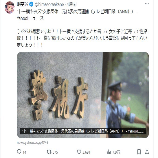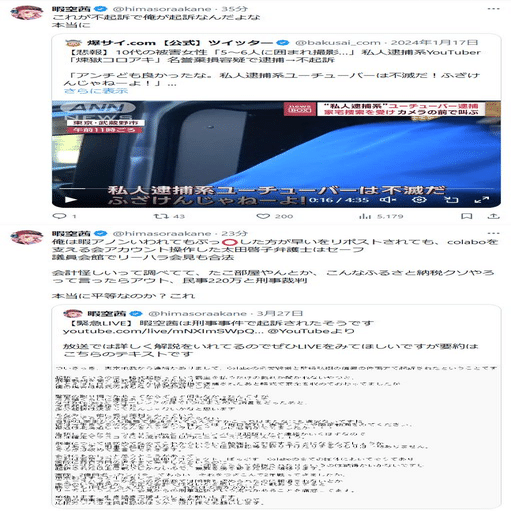 警察は暇空の虚偽告発等罪など仕掛り中の捜査を急いでほしいし、東京都などは刑事告訴を急いでほしい。違法性の判断ができずむしろ被害者意識、迫害妄想を募らせる暇空らを自由にさせていては被害が止まらない。