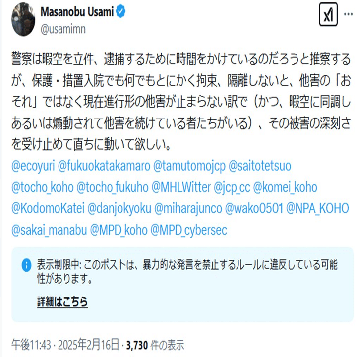 とにかく刑事を急ぐべき。警察も東京都など政治・行政も。いつまで暇空らに自由に加害させているんだってことだよ。被害者はいつまで耐えればいいのか?見えない犠牲の発生をいつになったら止められるのか?