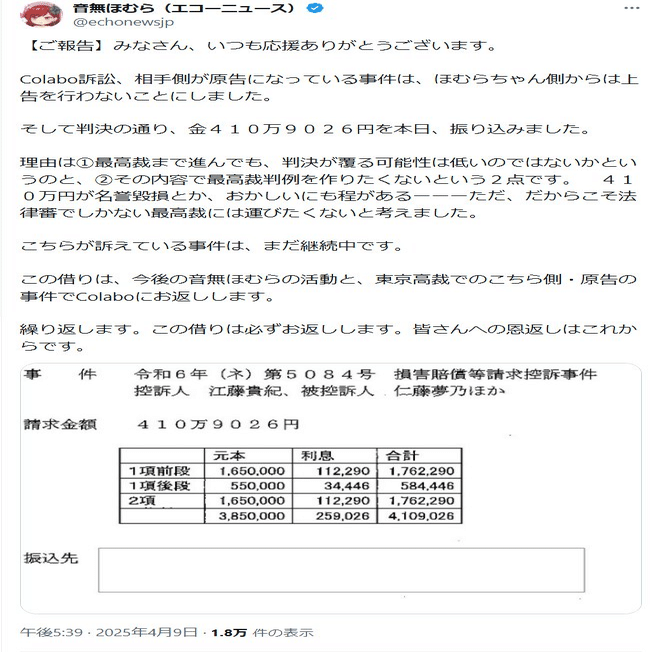 エコーニュースというブログサイトをやっている江藤(アニメアイコンの40代男性)をColaboが訴えた裁判で、江藤に385万円の支払いが命じられました!