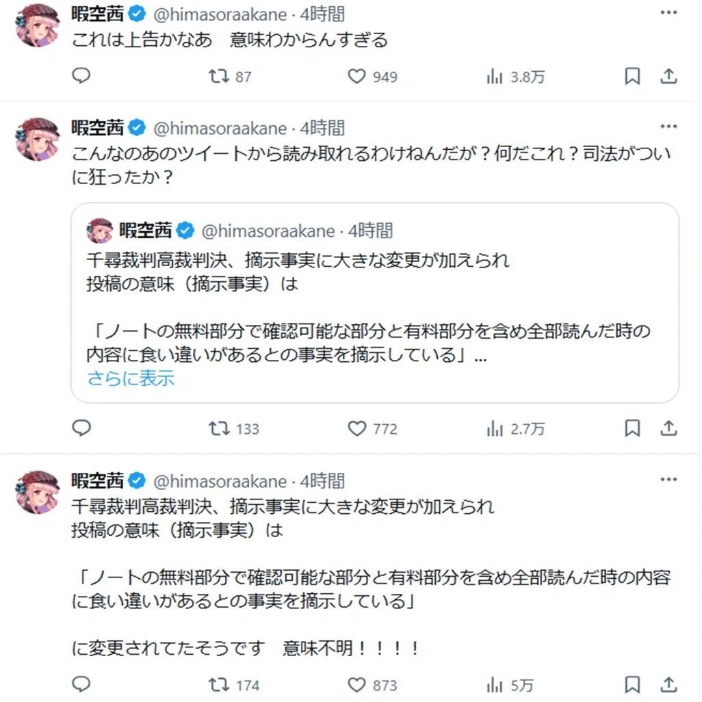 暇空は判決理由で明快に書かれていることすら理解せず妄想としか言えない読みをしている上、相変わらずの加害責任の否認、矮小化と被害妄想。歴史改ざんというよりも自らの言動についての記憶改ざん。ずっと言っている通り、私怨と私益でColaboを叩き始めたことを正当化、合理化するためにとてつもなく妄想を膨らませてきた結果、現実検討能力は全く失われている。