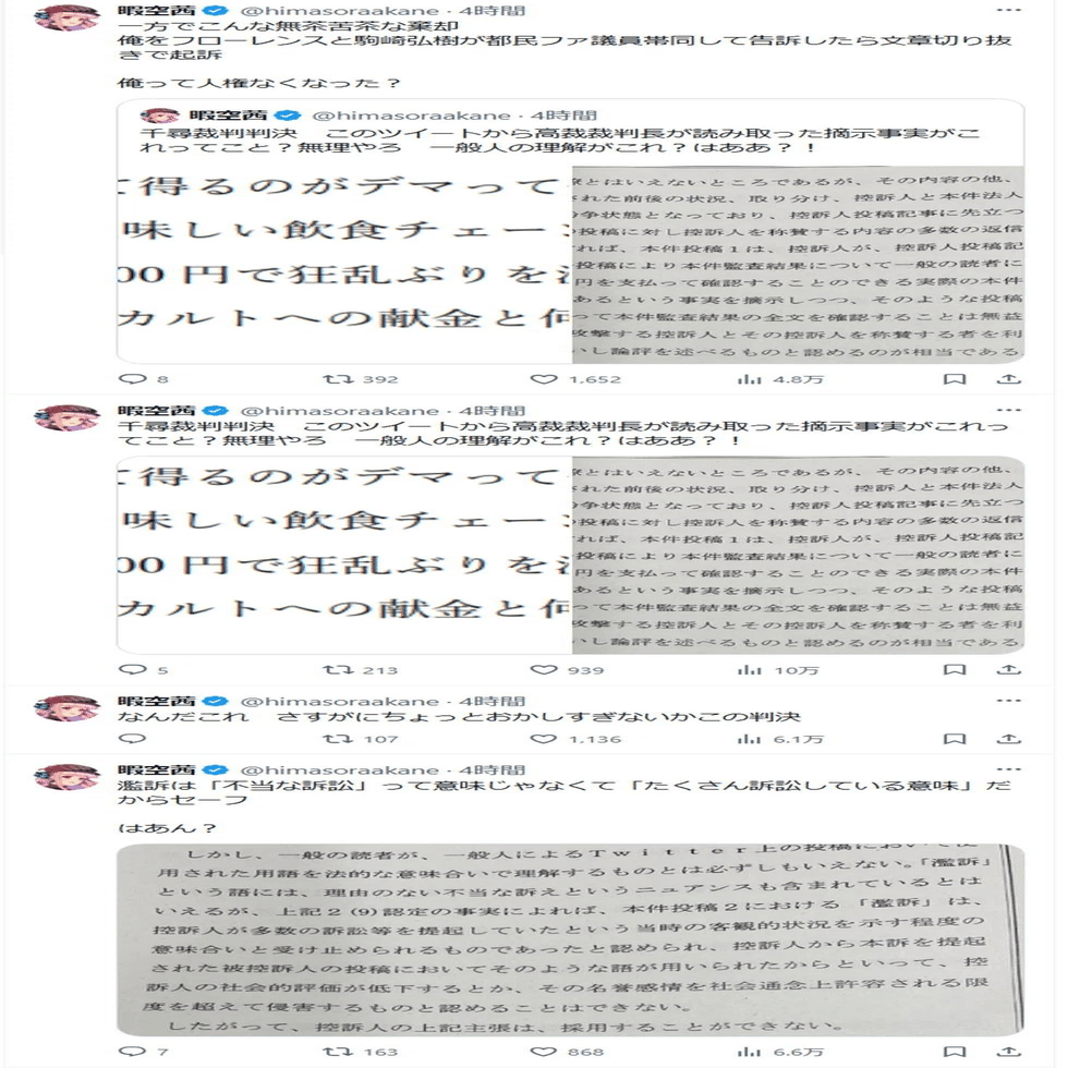 暇空は「意味わからん」「司法がついに狂ったか?」となどと錯乱状態。誇大妄想、迫害妄想、被害者意識、現実検討能力喪失、全てが露わ。ほんとにもう止めないと。