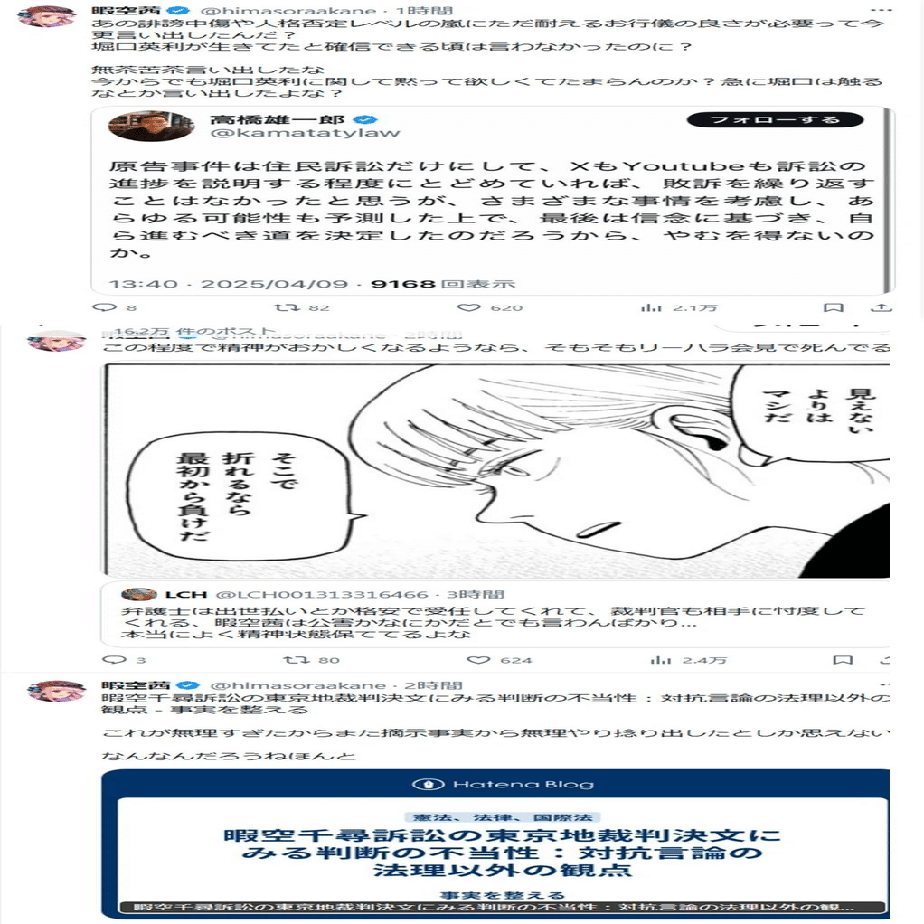 暇空の言動そのものはとうに現実と接地しておらず了解不能な領域にあるし、その軌跡を辿って意味を把握することも不可能(その価値もない)。と同時に、暇空の言動が何故そのようであるのかということについては現象学等の道具立てで了解可能ではある。現れ方は異なれ、このことは他の連中にも当てはまる。要は、繰り返し言っていることだが、コミュニケーションが成立し得ず、法的強制力で止めるしかないということがさらにさらに鮮明になっている。