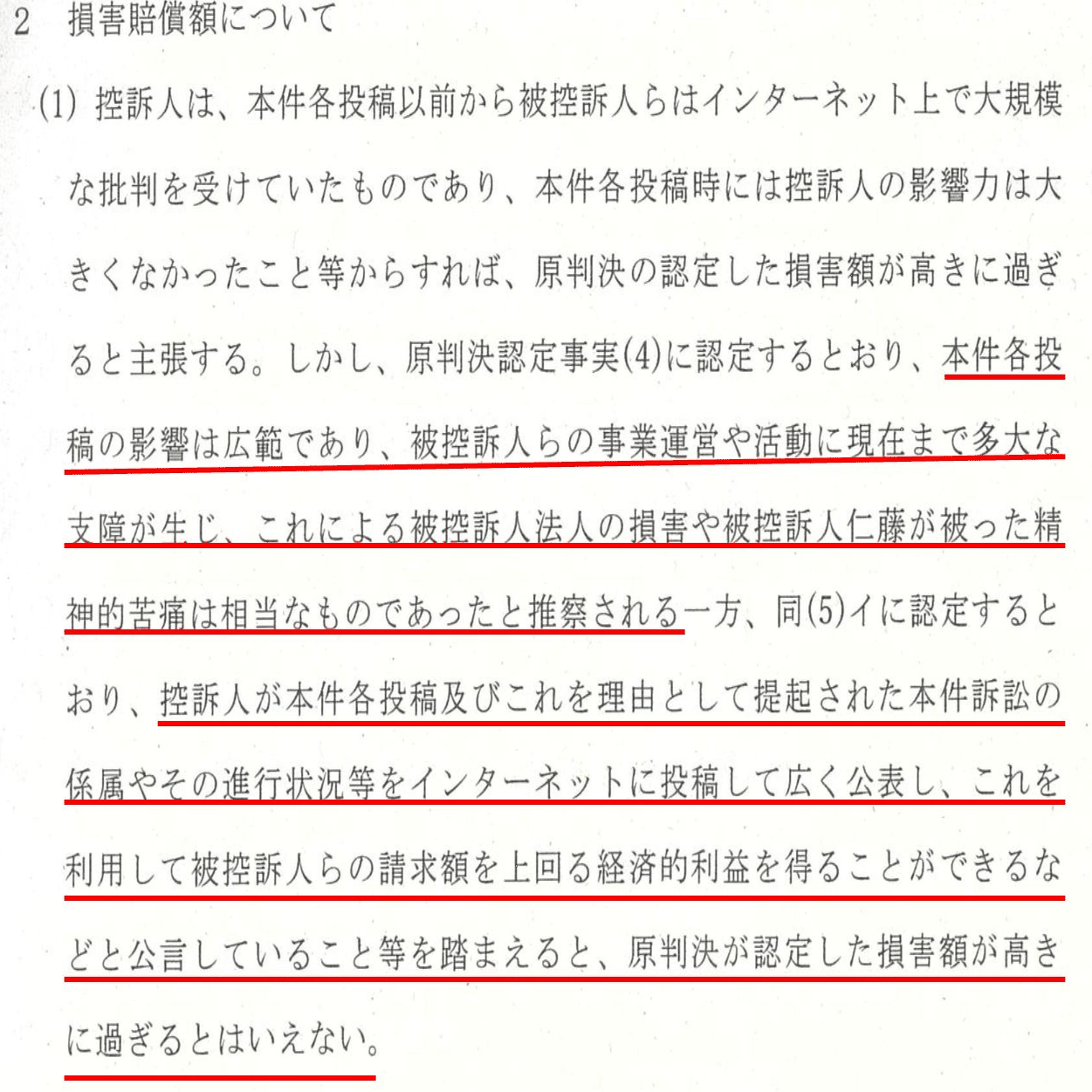 「大量脱税」について、「江藤氏側は意見論評に過ぎず、事実の摘示を行ったものではないなどと反論したが、裁判所は『疑問形形の形式をとりつつも脱税の事実を摘示したとみるのが自然』など、事実の摘示と認定した。