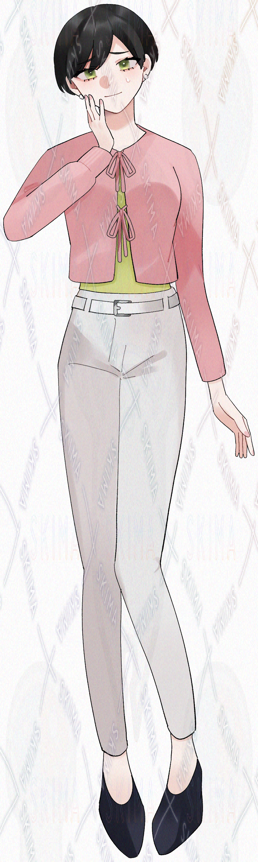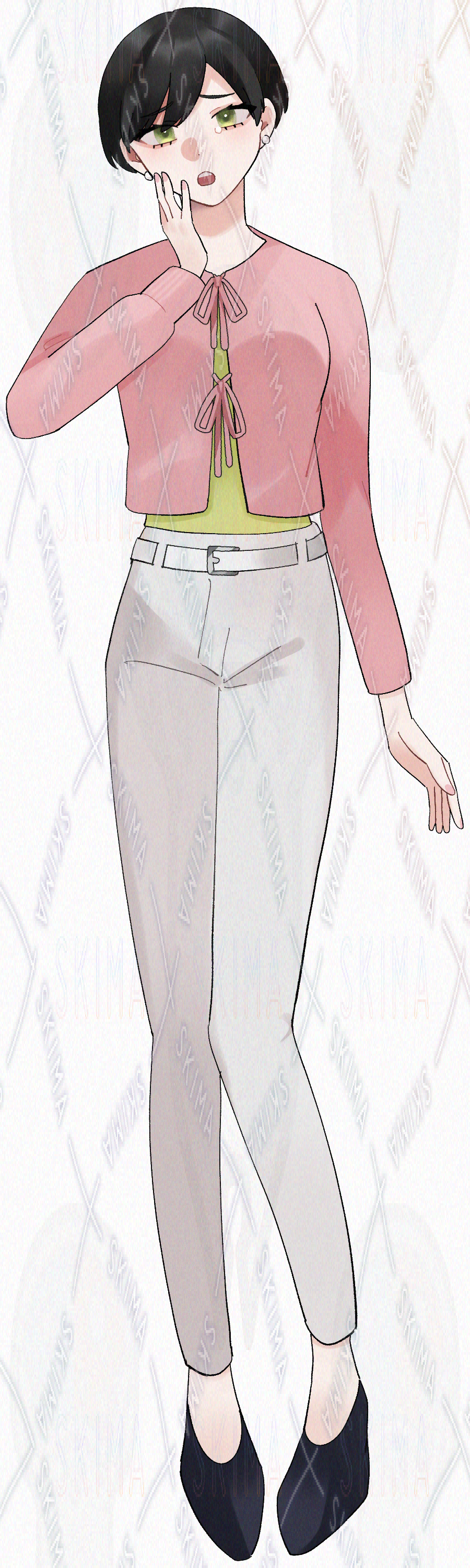 春色ファッションの黒髪ショートカットの女性の立ち絵です。