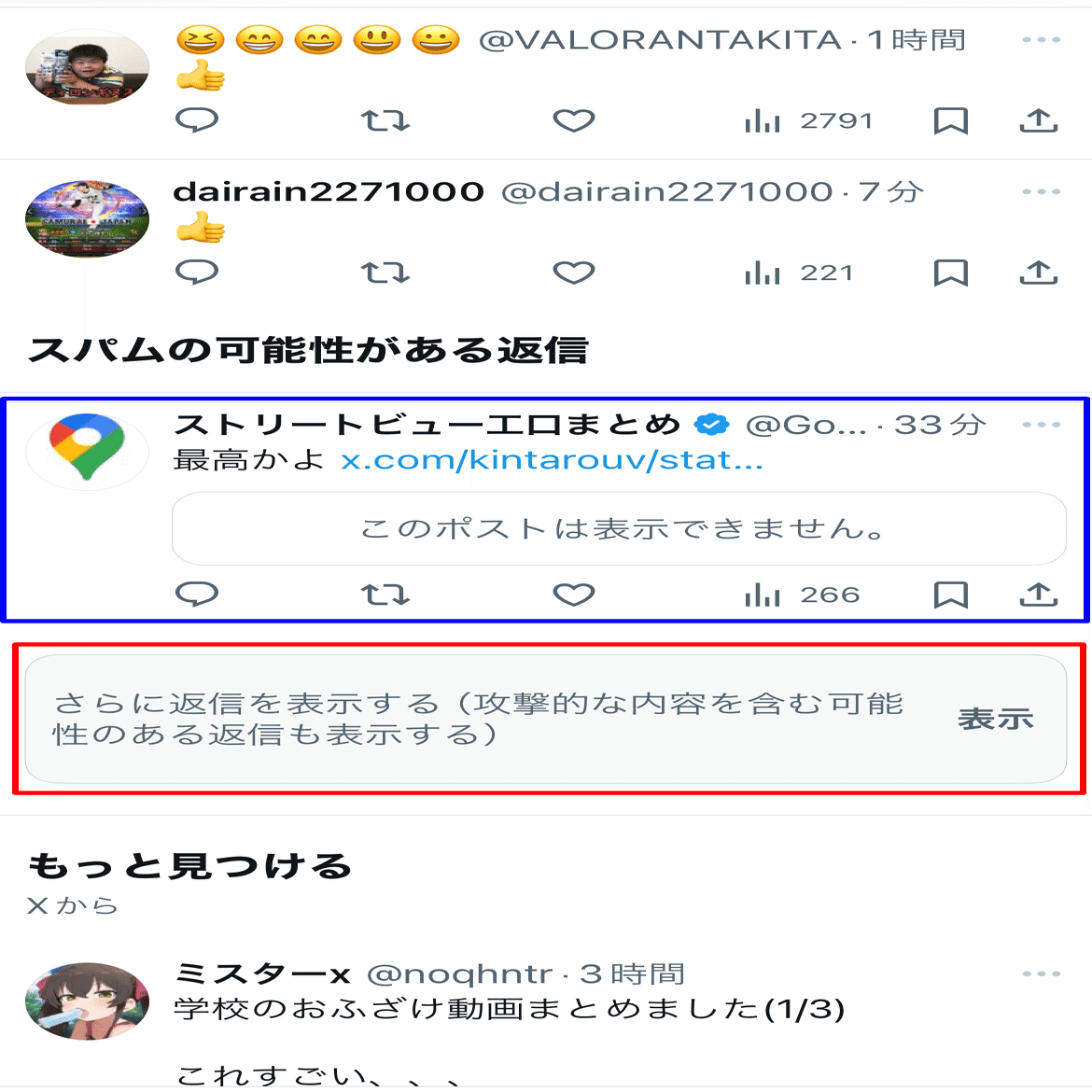 【攻撃的に分類】されると画像の様にリプ欄の一番下で表示されるため、インプレッション(視聴回数)が稼げなくなります。
